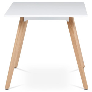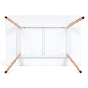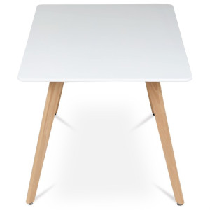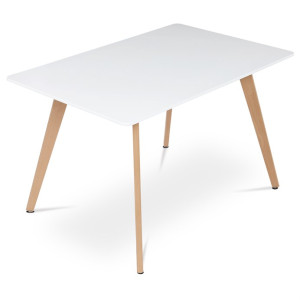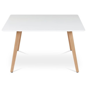 Jídelní stůl o rozměrech 120x80x74 cm kombinuje pevnou desku z MDF s matnou bílou povrchovou úpravou a nohy z masivního buku, které dodávají stabilitu a přírodní vzhled. Deska stolu je navržena s jemně zaoblenými rohy pro bezpečnost a pohodlí při používání. Masivní bukové nohy jsou vybaveny rektifikačními patkami, které umožňují vyrovnání nerovností podlahy a zajišťují stabilitu stolu. Matný lak na desce usnadňuje údržbu a odolává běžnému opotřebení. Stůl je pevný a vhodný pro každodenní použití v jídelnách i kuchyních.