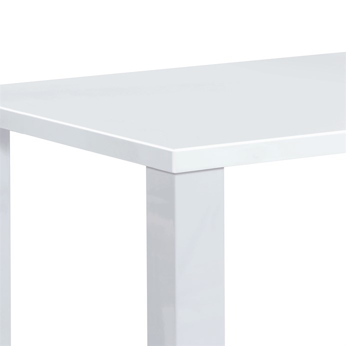 Jídelní stůl o rozměrech 160x90x76 cm je vyroben z MDF materiálu s povrchovou úpravou v lesklém bílém laku, který dodává moderní a svěží vzhled. Deska stolu je pevná a hladká s vysokým leskem, který usnadňuje údržbu a odolává běžnému opotřebení. Robustní nohy stolu jsou rovněž z MDF a zajišťují stabilitu a pevnost celé konstrukce. Zaoblené rohy desky přispívají k bezpečnosti a zároveň podtrhují minimalistický design. Stůl je vhodný pro každodenní použití v jídelnách i kuchyních, kde oceníte jeho jednoduchost a snadnou údržbu.