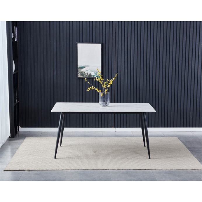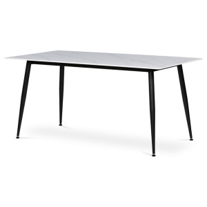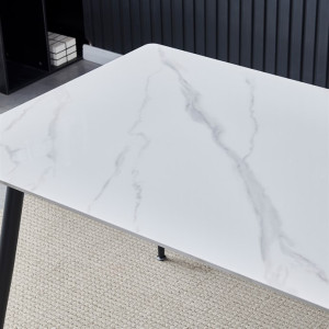 Jídelní stůl o rozměrech 160x90x76 cm kombinuje moderní design s praktickými vlastnostmi. Deska je vyrobena ze slinuté keramiky v matném provedení s imitací bílého mramoru, která nabízí odolnost proti poškrábání a snadnou údržbu. Černé kovové nohy s mírně zkoseným tvarem zajišťují stabilitu a pevnost celé konstrukce. Matný povrch desky přispívá k elegantnímu vzhledu a zároveň minimalizuje odlesky. Stůl je vhodný pro každodenní použití v jídelně či kuchyni, kde oceníte jeho kombinaci estetické hodnoty a funkčnosti.