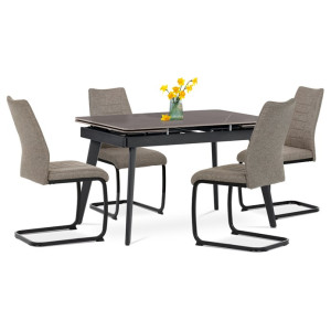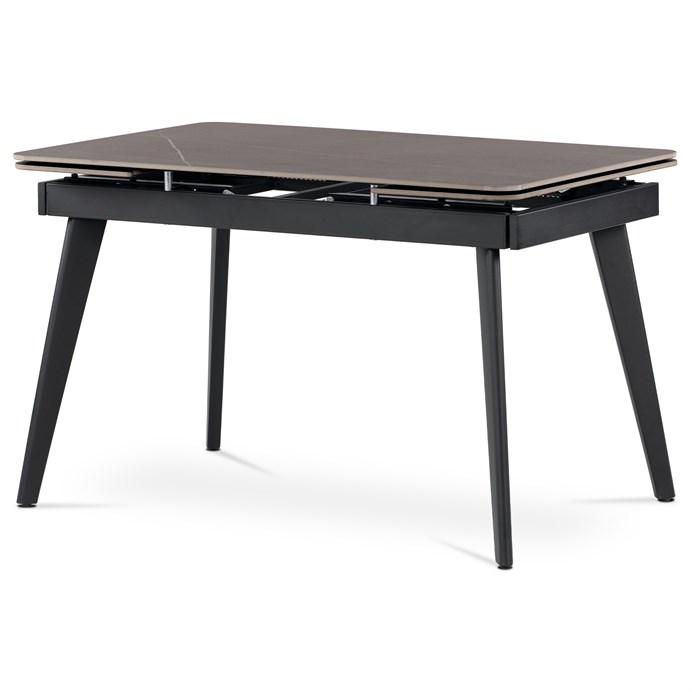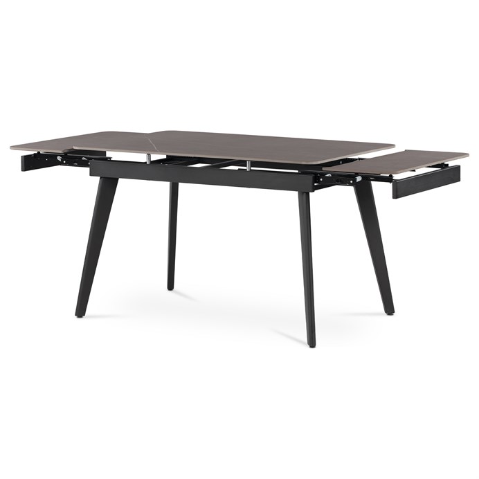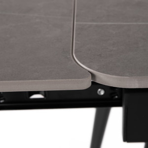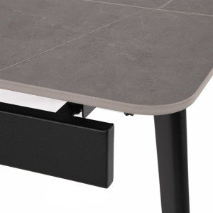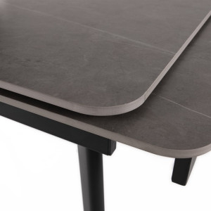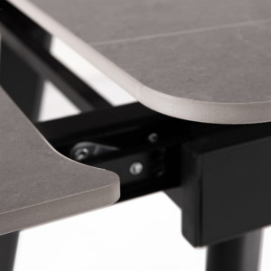 Jídelní stůl s rozkládací funkcí nabízí praktické řešení pro flexibilní uspořádání prostoru. Deska je vyrobena ze slinuté keramiky v šedém mramorovém dekoru s matným povrchem, který je odolný vůči poškrábání a snadno se udržuje. Stabilní kovové nohy v černém matném laku zajišťují pevnou oporu a dlouhou životnost. Rozkládací mechanismus umožňuje prodloužení stolu o dvě přídavné desky, čímž se zvětší pracovní plocha z 120 na 180 cm při zachování šířky 80 cm. Díky kombinaci kvalitních materiálů a funkčnímu designu je stůl vhodný jak do moderních interiérů, tak pro každodenní použití.