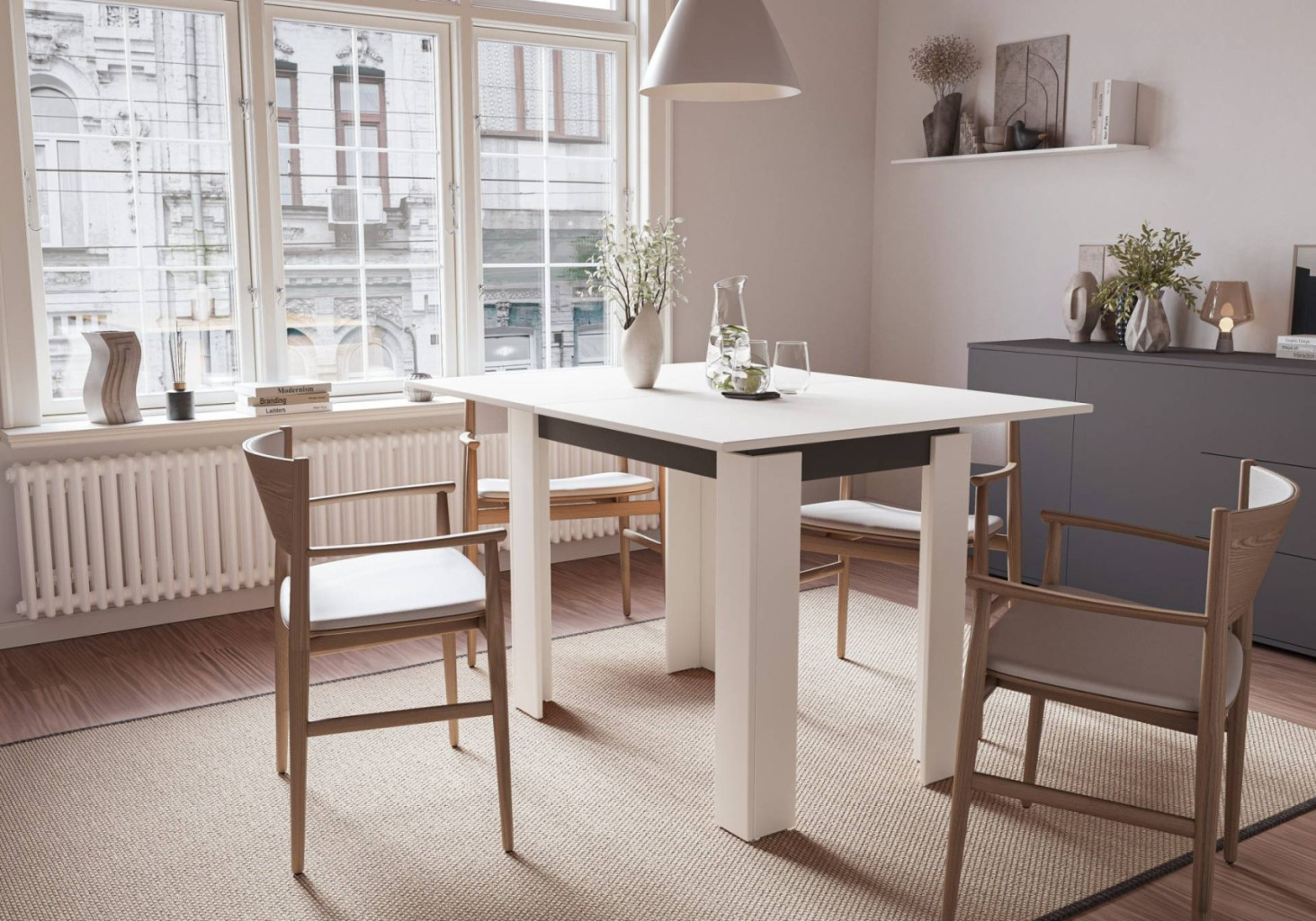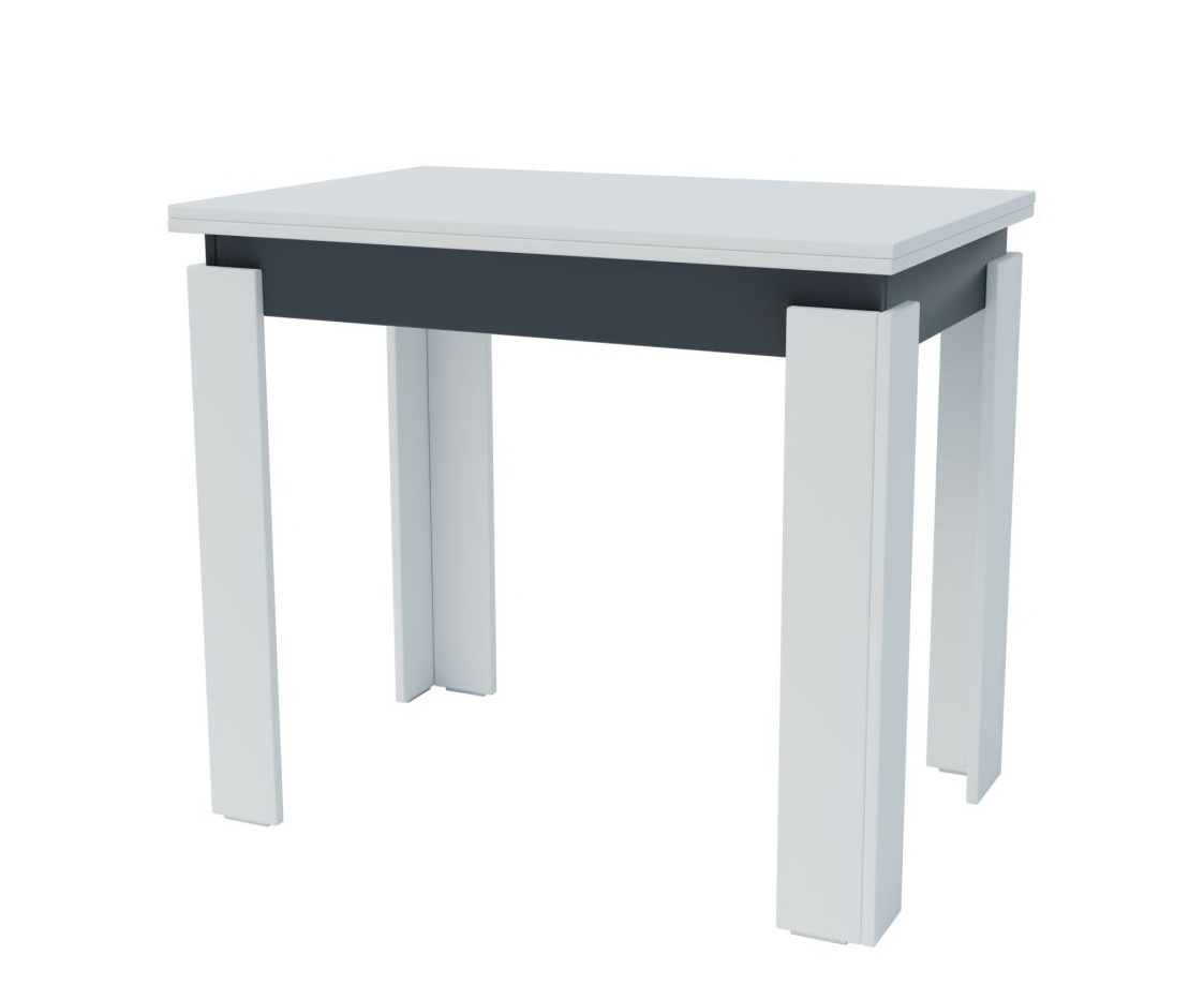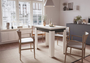 Dotaz na produkt Na splátky ještě dnesRozkládací jídelní stůl v moderním provedení je vyroben z kvalitní LTD v barevné kombinaci matná bílá/šedý antracit. Plocha stolu před rozložením je 90x60 cm, plocha stolu po rozložení je 120x90 cm. Dodáváme v demontovaném stavu.