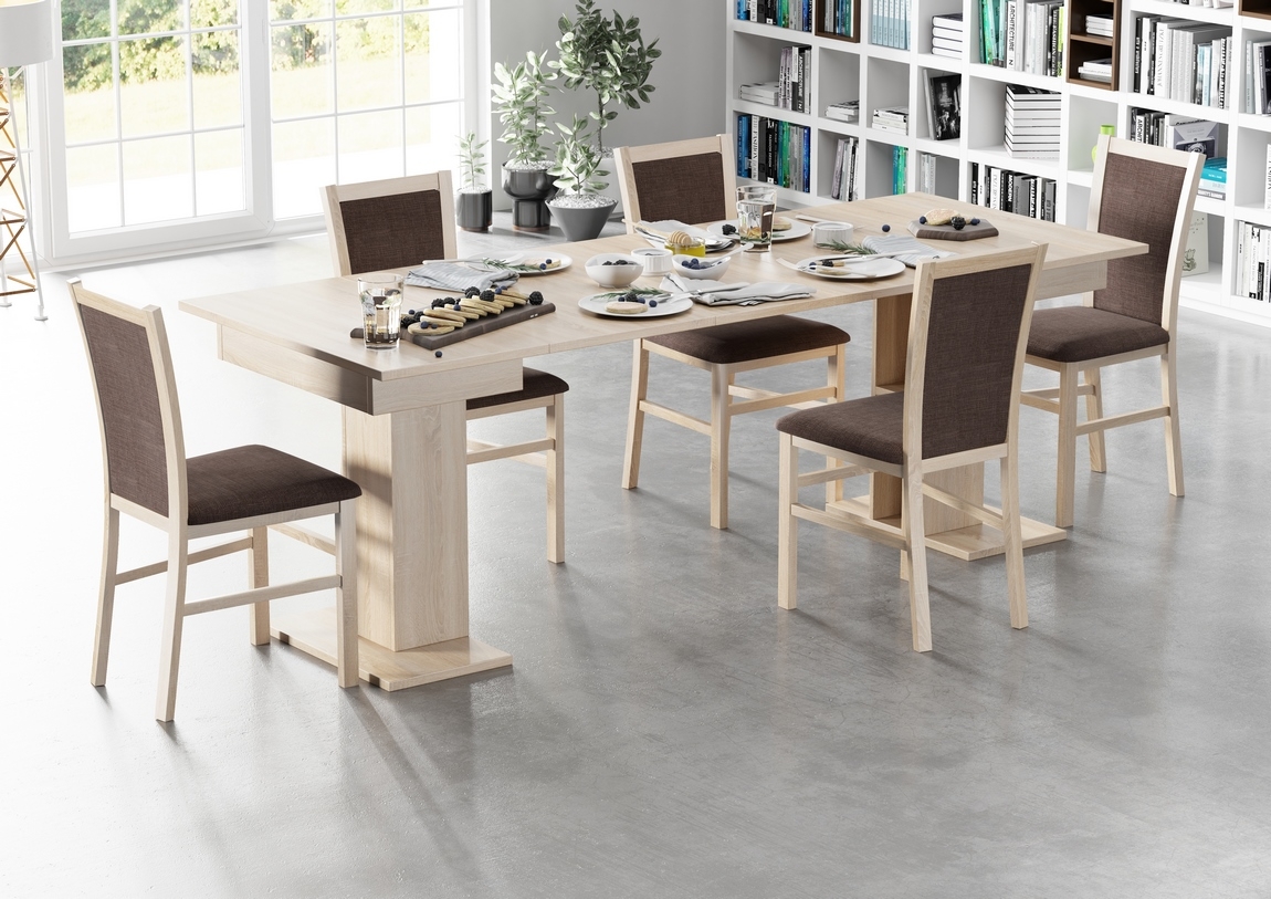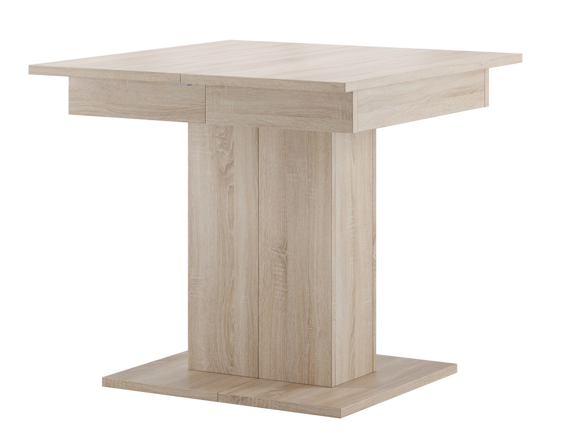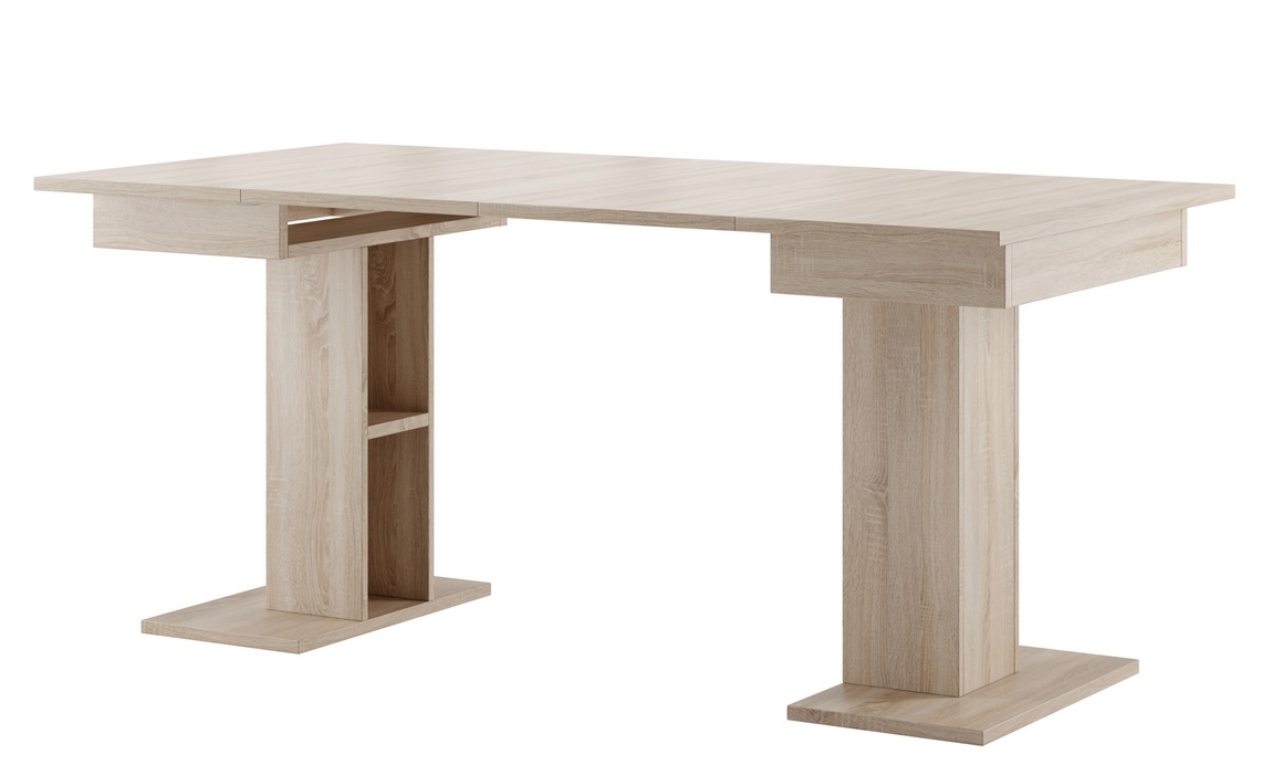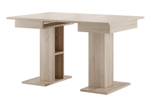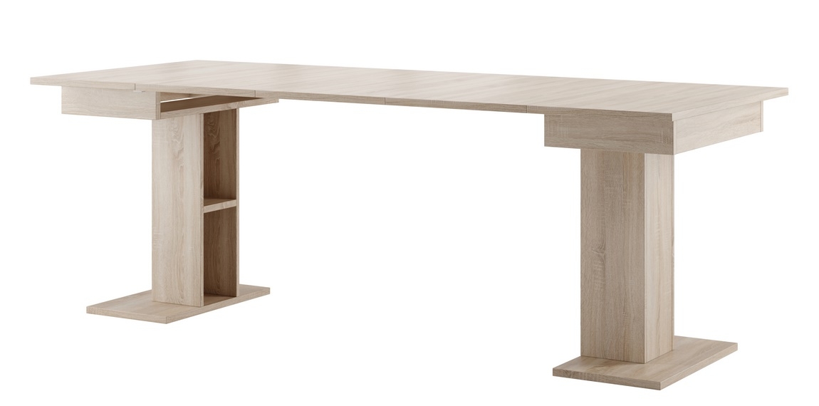 Dotaz na produkt Na splátky ještě dnesJídelní stůl rozkládací STAR 05 lze rozložit na tři velikosti. Stůl jde rozložit na 130 x 85 cm, 175 x 85 cm nebo 210 x 85 cm. Stůl je vhodný až pro 10 osob. Noha stolu se při rozkladu rozdělí na dvě poloviny, ve kterých jsou praktické police. Deska je vyrobena z kvalitního LTD v barvě dub sonoma, noha z MDF. Dodáváme v demontovaném stavu.