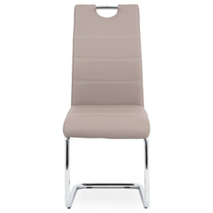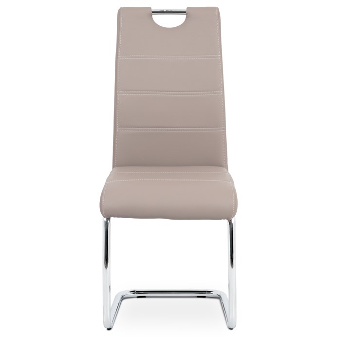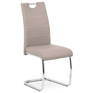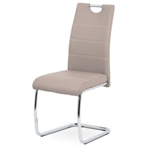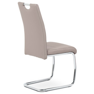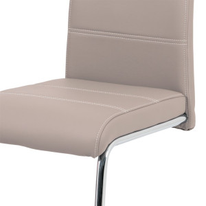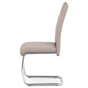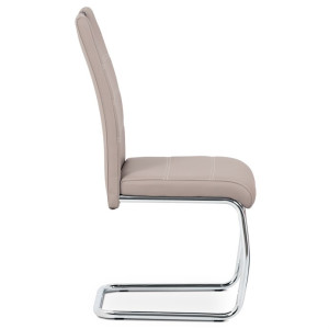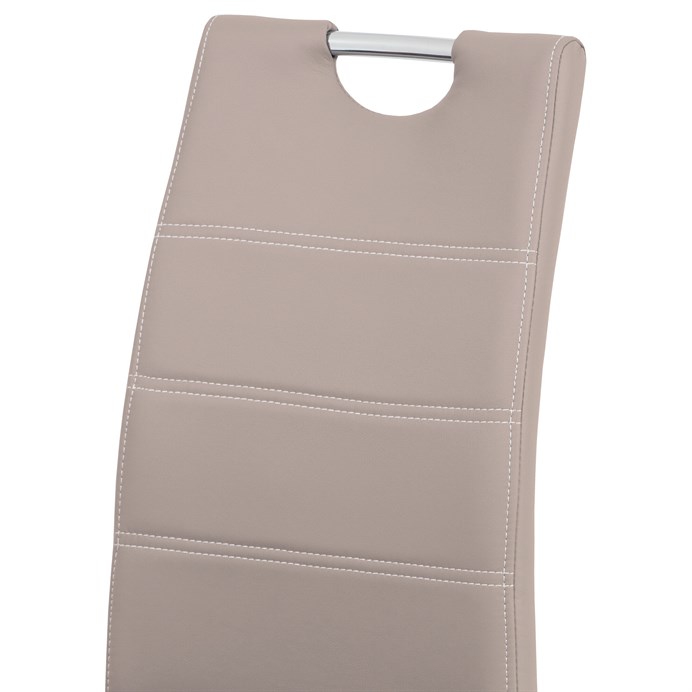 Jídelní židle s označením HC-481 LAN nabízí moderní design v lanýžovém odstínu ekokůže s kontrastním bílým prošitím, které podtrhuje její elegantní vzhled. Potah je vyroben z kvalitní ekokůže, která se snadno udržuje a je příjemná na dotek. Pevná kovová pohupová podnož v chromovaném provedení zajišťuje stabilitu a zároveň umožňuje mírný pohyb pro zvýšení pohodlí při sezení. Židle nemá područky ani otočný mechanismus, což ji činí vhodnou především k jídelním stolům s úsporou prostoru. Díky ergonomicky tvarovanému sedáku a opěradlu poskytuje komfortní podporu během stolování.