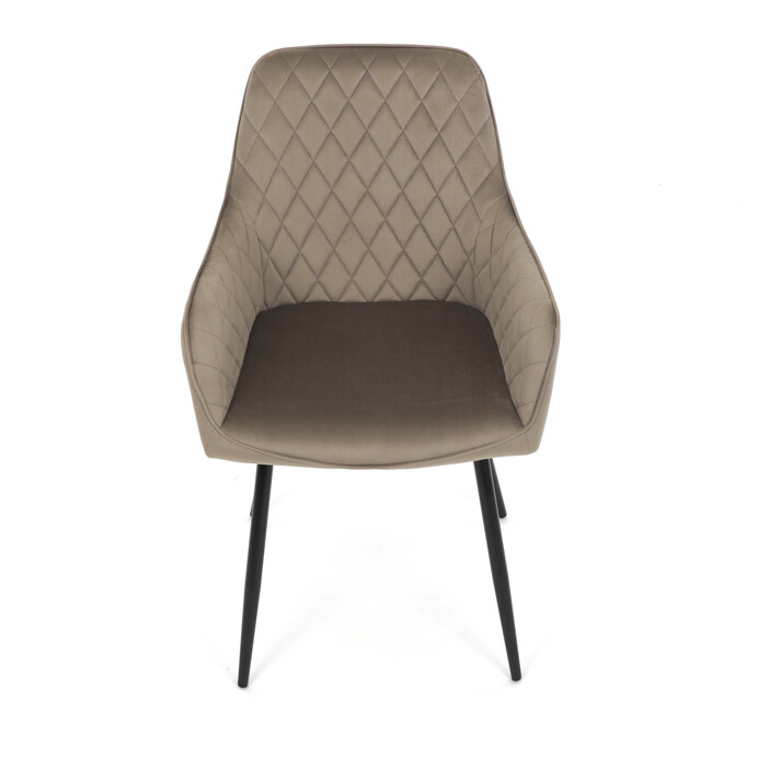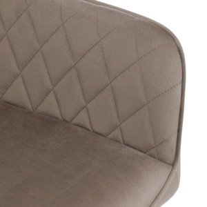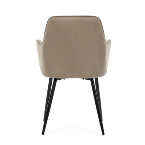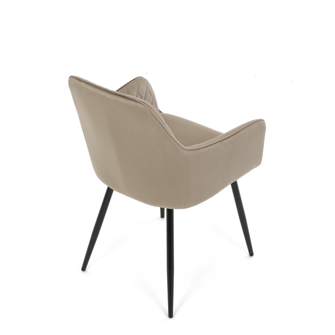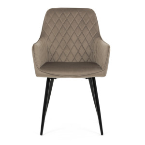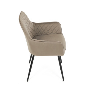 Jídelní židle s označením DCH-215 CAP4 nabízí komfortní sezení díky čalounění z jemné sametové látky v cappuccino odstínu, která je doplněna designovým prošitím v kosočtverečkovém vzoru. Pevné černé kovové nohy zajišťují stabilitu a dlouhou životnost, zatímco integrované područky přispívají k pohodlí při sezení. Sedák i opěradlo jsou ergonomicky tvarované pro podporu správného držení těla během jídla nebo odpočinku. Díky kombinaci kvalitních materiálů a precizního zpracování je židle vhodná do moderních i klasických interiérů. Nosnost a přesné rozměry nejsou uvedeny, avšak konstrukce odpovídá standardům pro běžné domácí použití.