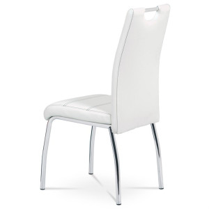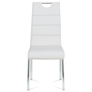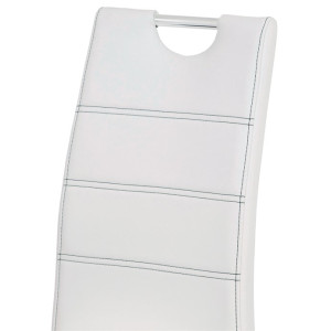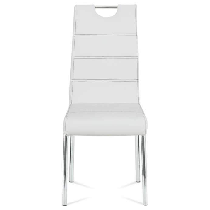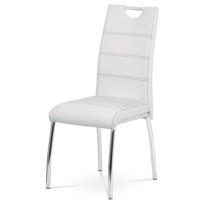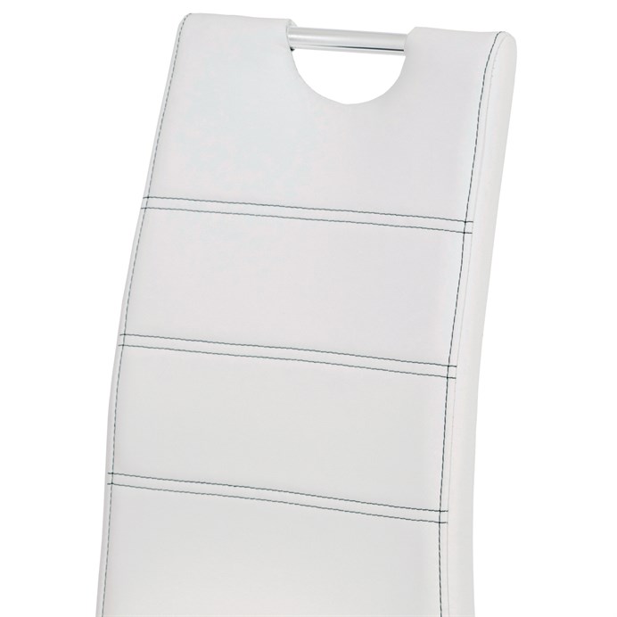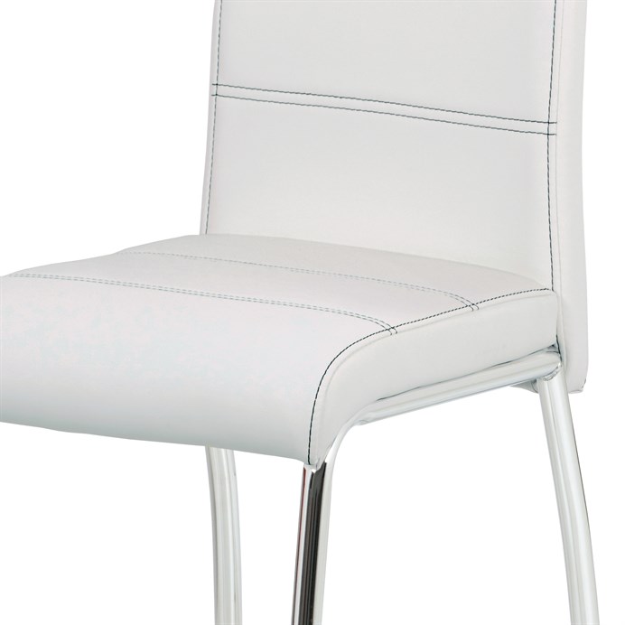 Jídelní židle s potahem z bílé ekokůže je doplněna výrazným černým prošitím, které podtrhuje její moderní design. Čtyřnohá podnož z chromovaného kovu zajišťuje stabilitu a pevnost při sezení. Sedák i opěradlo jsou ergonomicky tvarované a čalouněné pro pohodlné posezení během jídel i delších setkání. Židle nemá područky ani výškové nastavení, což usnadňuje její umístění kolem jídelního stolu a šetří prostor. Povrch ekokůže se snadno udržuje a je navržen pro dlouhou životnost.