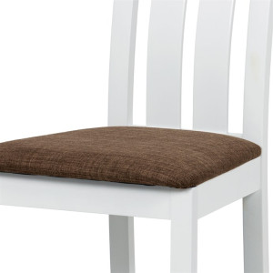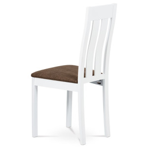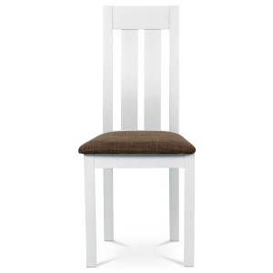Jídelní židle BC-2602 WT je vyrobena z masivního buku v bílé barvě, která dodává interiéru svěží a čistý vzhled. Pevná masivní konstrukce zajišťuje stabilitu a dlouhou životnost, zatímco ergonomicky tvarované opěradlo s vertikálními výřezy podporuje pohodlné sezení. Sedák je čalouněný hnědou látkou, která přispívá k příjemnému komfortu a snadné údržbě. Židle nemá područky ani otočný mechanismus, což ji činí vhodnou pro klasické jídelní prostory. Díky kvalitnímu zpracování a použitým materiálům je nosnost židle spolehlivá pro běžné užívání v domácnostech i restauracích.