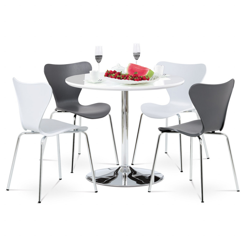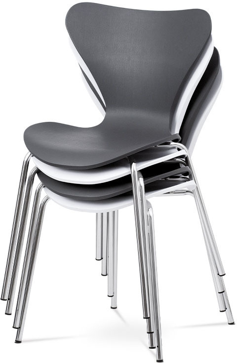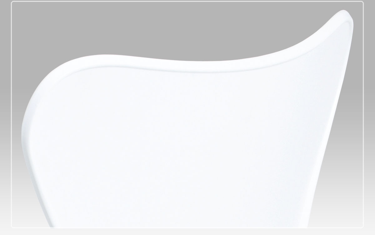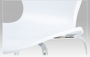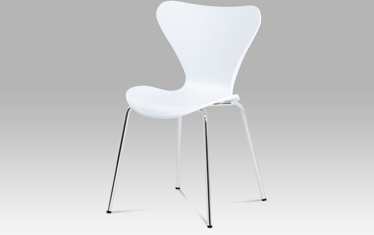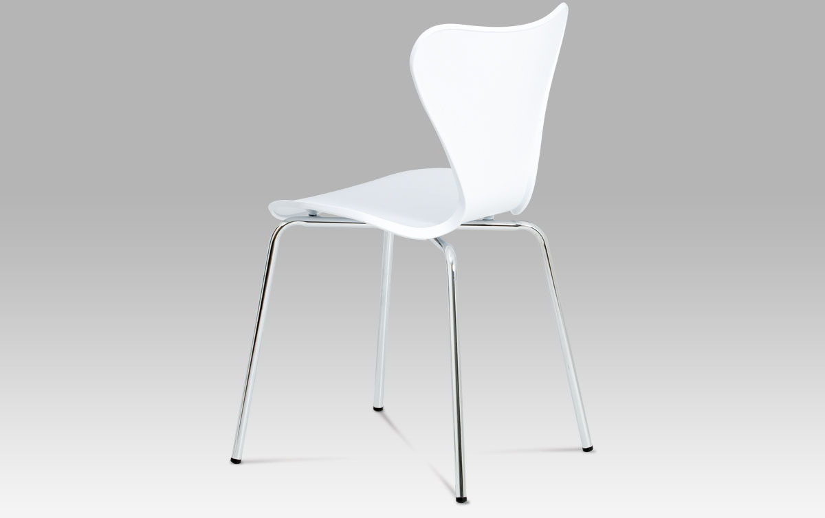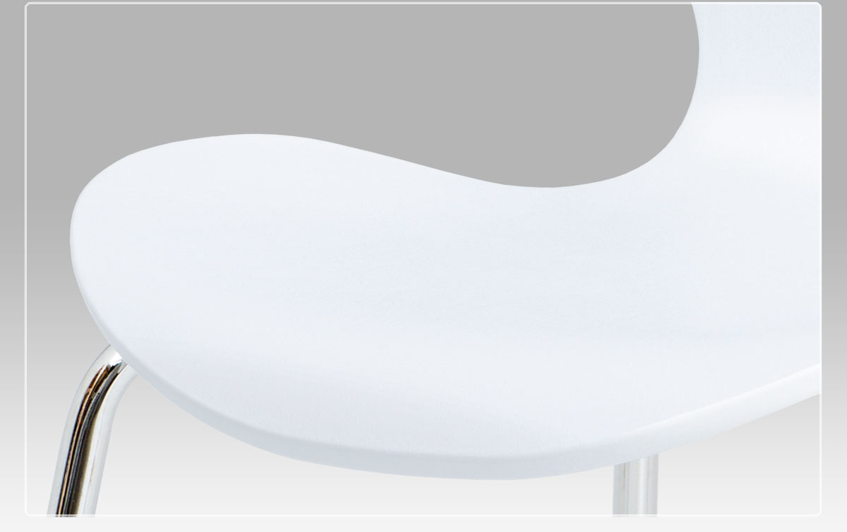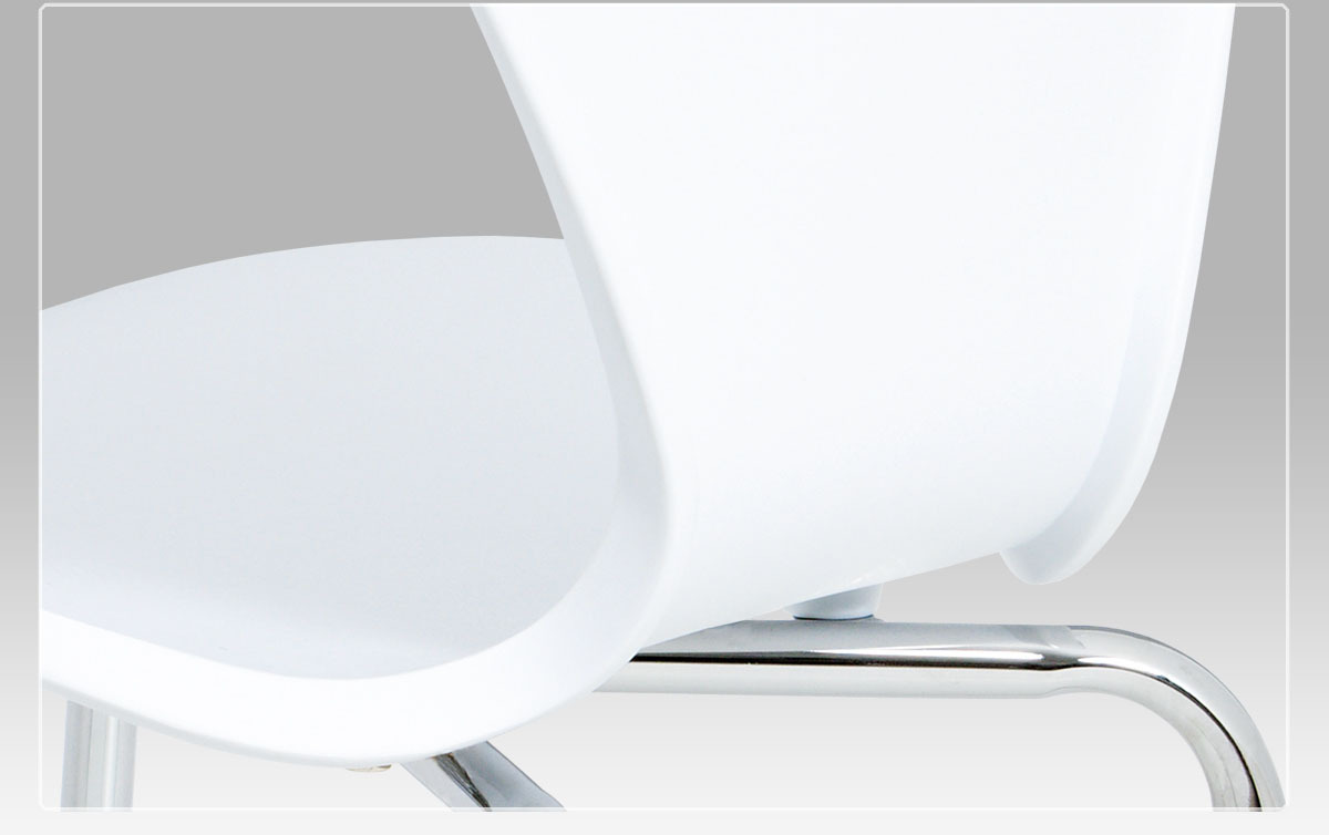 Designovaná, minimalistická a nadčasová – to vše je tato jídelní židle ve skandinávském stylu a dokonalosti. Sedák a opěrák je tvořen z jednoho kusu bílého plastového výlisku, s dekorem dřeva na čelní straně. Díky svému jedinečnému tvarování je židle velmi pohodlná. Klasická čtyřnohá podnož je vyrobena z kovových ohýbaných trubek s chromovanou povrchovou úpravou. Ukončení je plastovými černými kluzáky, omezující na minimum riziko poškození podlahové plochy.