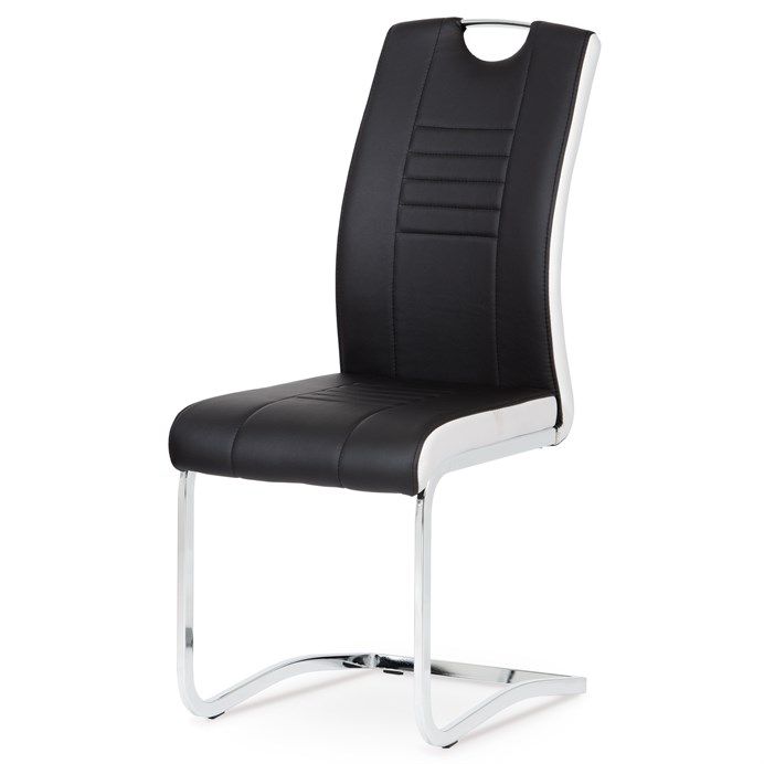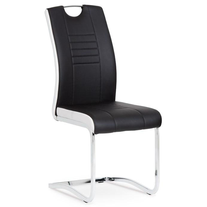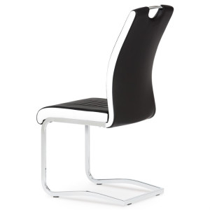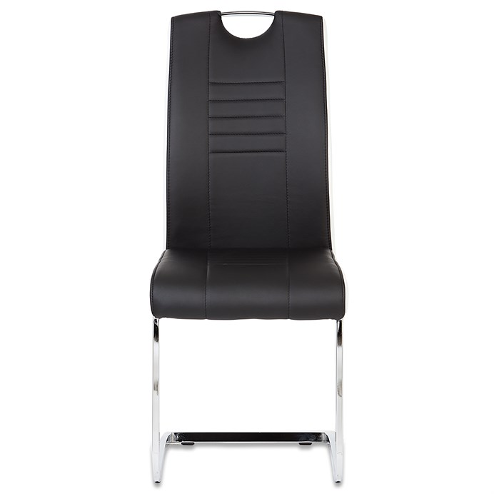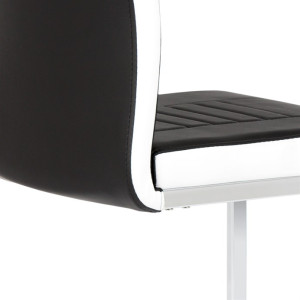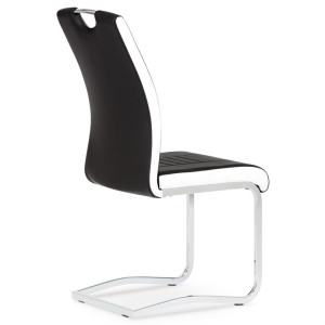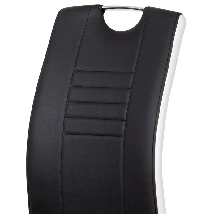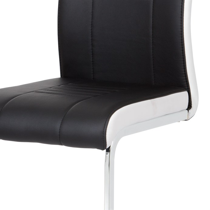 Jídelní židle s označením DCL-406 BK kombinuje moderní design s praktickým provedením. Čalounění z kvalitní ekokůže v černé barvě je doplněno bílými boky, které zvýrazňují elegantní kontrast a čisté linie. Sedák i opěradlo jsou zdobeny designovým prošitím, které podtrhuje stylový vzhled a zároveň přispívá k větší odolnosti potahu. Pevná kovová podnož s chromovaným povrchem zajišťuje stabilitu a dlouhou životnost židle. Absence područek umožňuje snadné zasunutí pod stůl a šetří prostor v jídelně.