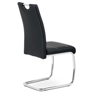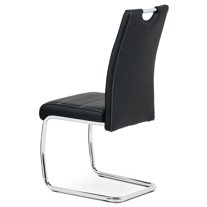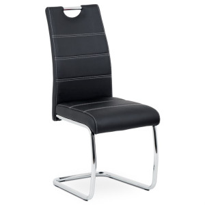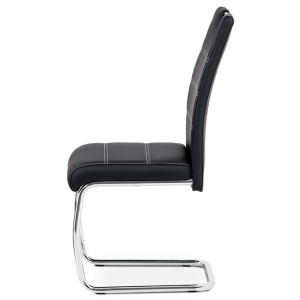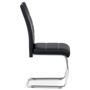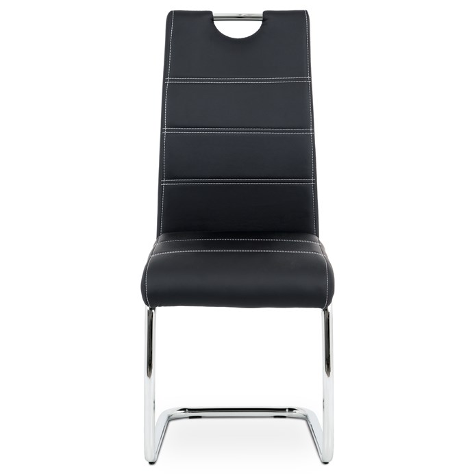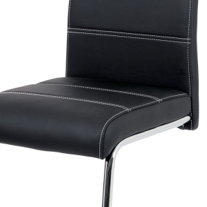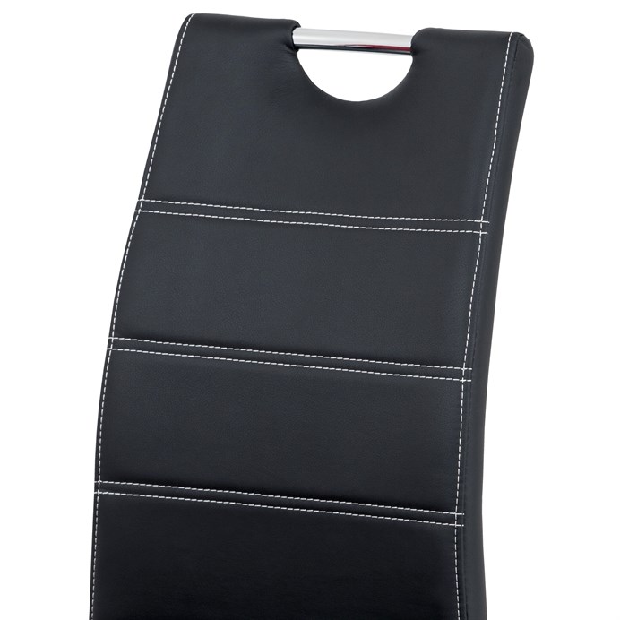 Jídelní židle s černým potahem z ekokůže a výrazným bílým prošitím nabízí moderní vzhled a snadnou údržbu. Pohupová podnož z chromovaného kovu zajišťuje příjemný pohyb při sezení a zároveň stabilitu. Ergonomicky tvarované opěradlo i sedák jsou vyplněny měkkou výplní pro pohodlné posezení během jídel i delších setkání. Absence područek umožňuje snadné zasunutí židle pod stůl a šetří prostor. Židle je vhodná do moderních interiérů, kde oceníte kombinaci designu a funkčnosti.