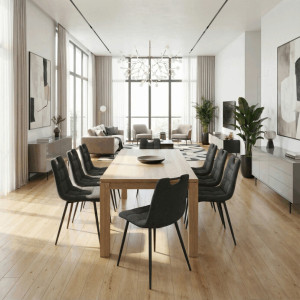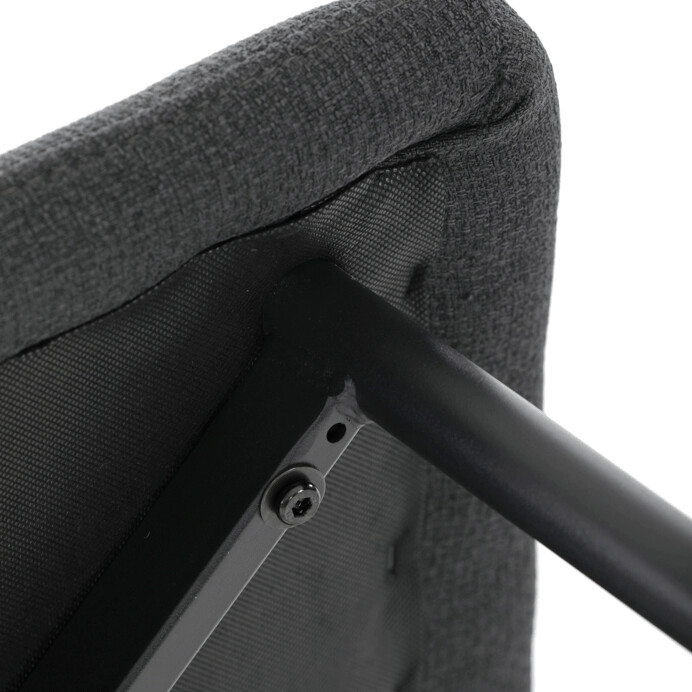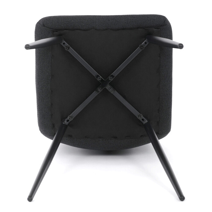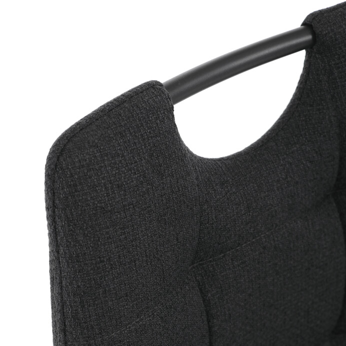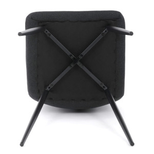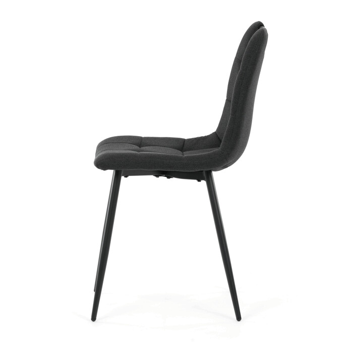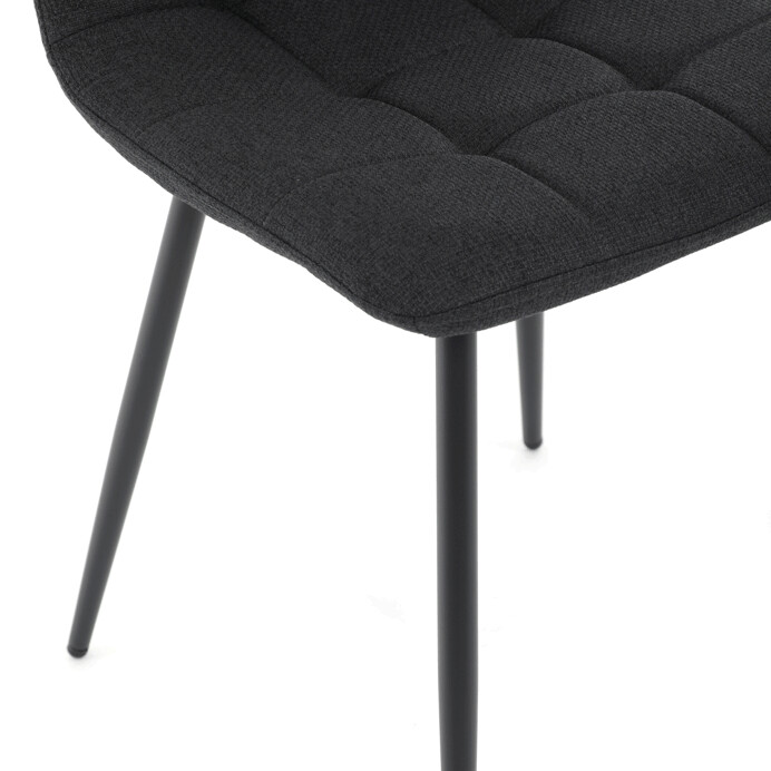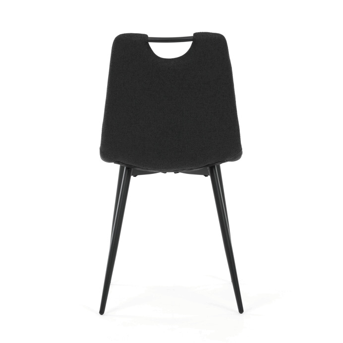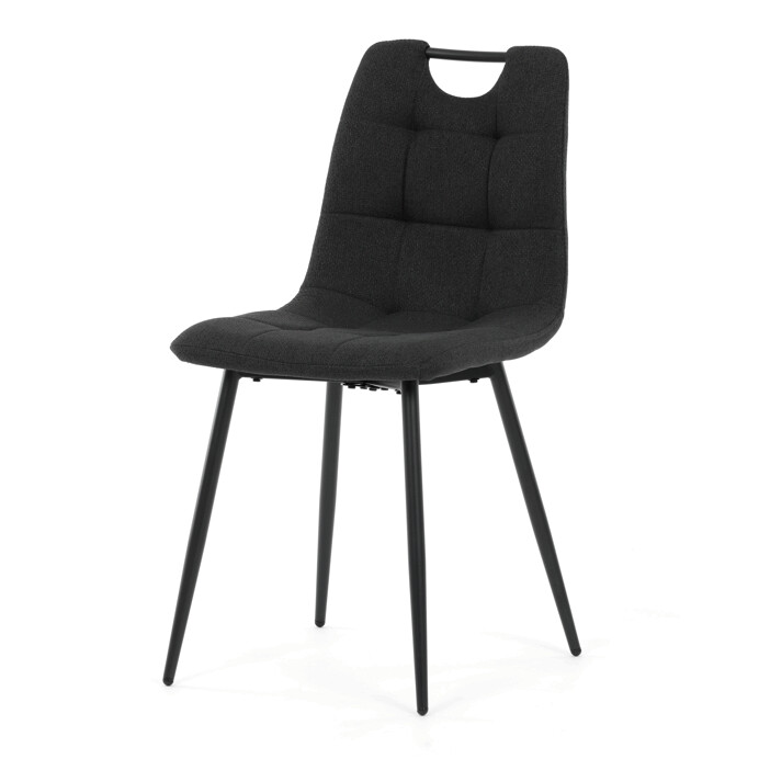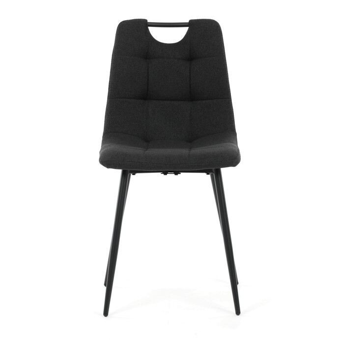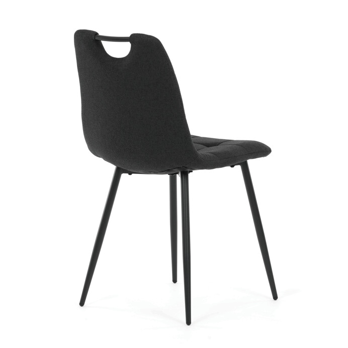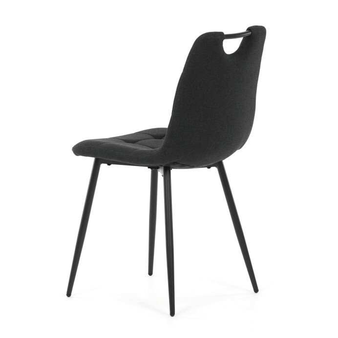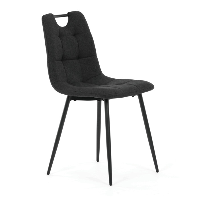 Jídelní židle s označením DCL-V2017 BK2 kombinuje moderní design s praktickými detaily. Sedák a opěradlo jsou potaženy černou látkou, která je snadno udržovatelná a doplněná designovým prošitím pro zvýraznění estetického dojmu. Černé kovové nohy s matnou povrchovou úpravou zajišťují stabilitu a pevnost celé židle. Součástí opěradla je praktické madlo, které usnadňuje manipulaci a přenášení židle. Židle nemá područky ani otočný mechanismus, což ji činí vhodnou pro jídelní prostory s omezeným prostorem.