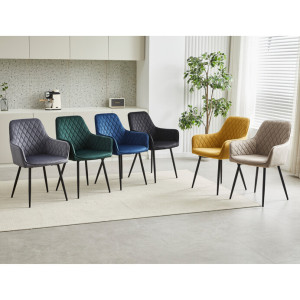 Jídelní židle s černým sametovým potahem nabízí pohodlné sezení díky měkkému čalounění a ergonomicky tvarovaným područkám. Čalounění je doplněno designovým prošitím v kosočtverečkovém vzoru, které zvýrazňuje její moderní vzhled. Pevné kovové nohy v černém matném provedení zajišťují stabilitu a dlouhou životnost židle. Sametová látka je příjemná na dotek a snadno se udržuje, což ji předurčuje k použití v jídelnách i dalších obytných prostorách. Židle není otočná, což přispívá k její jednoduché a pevné konstrukci.