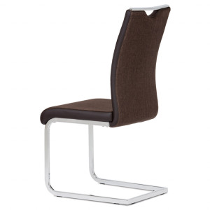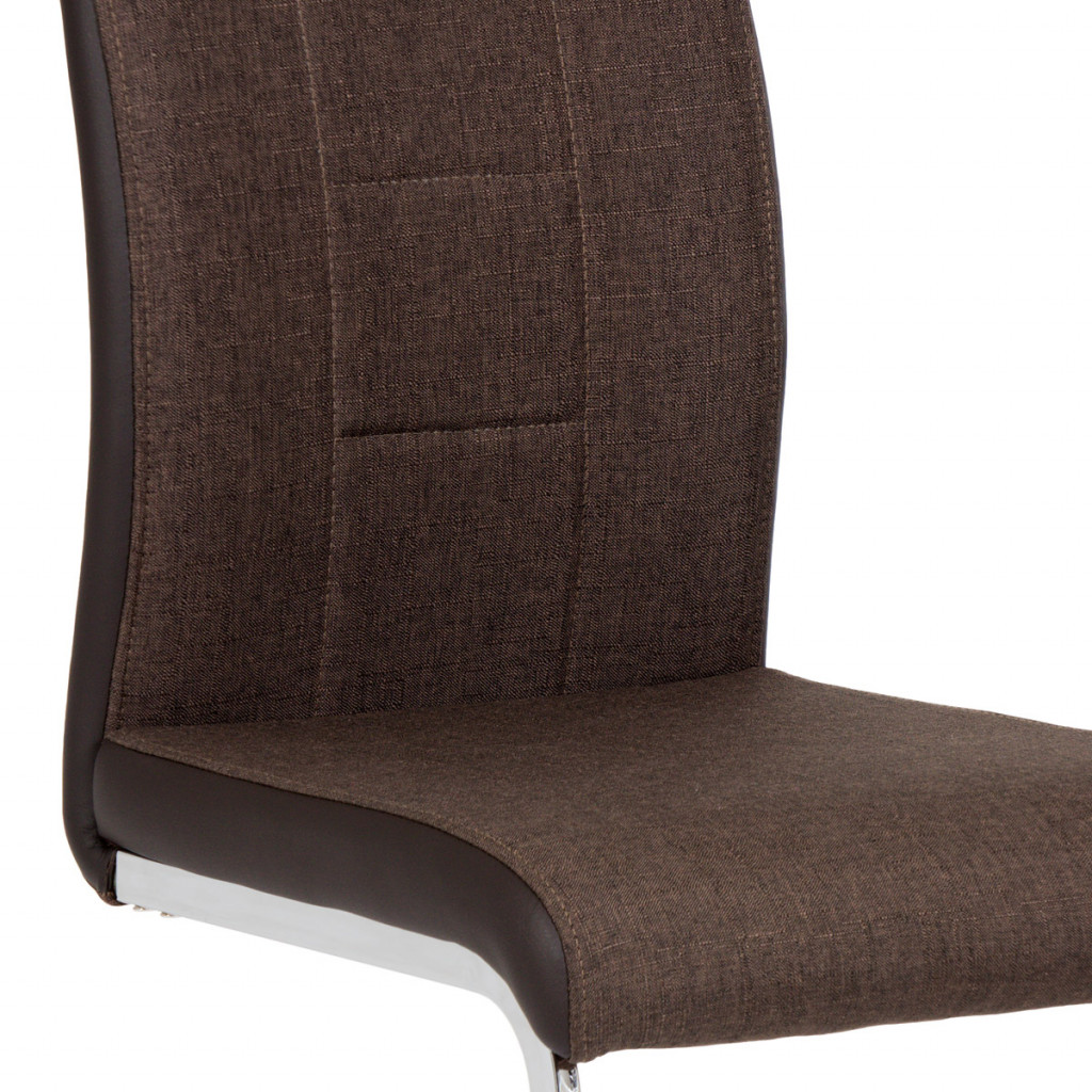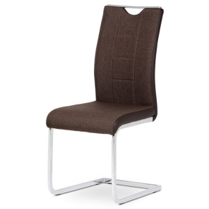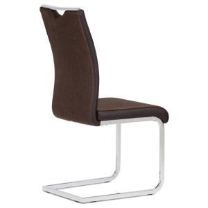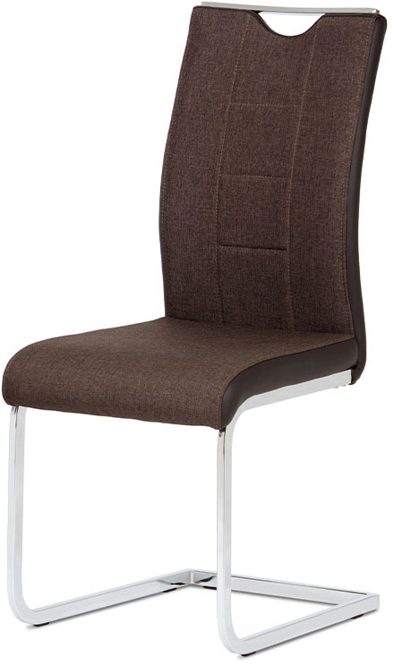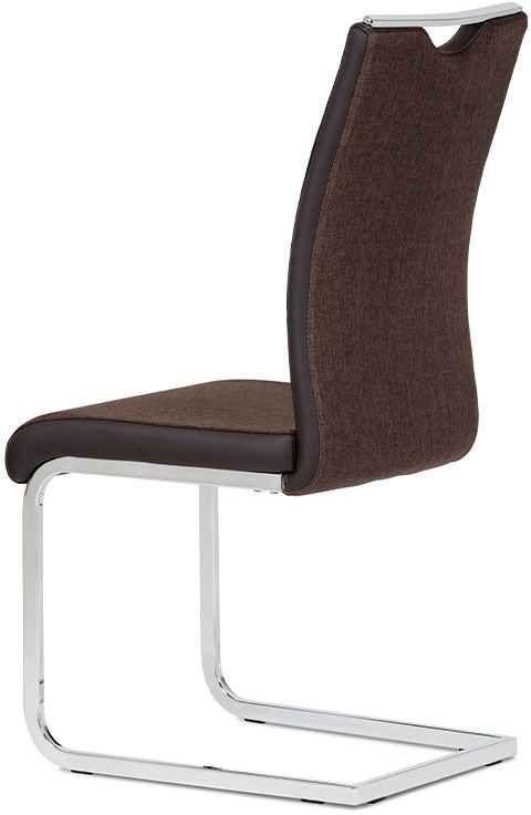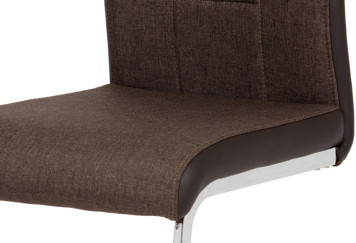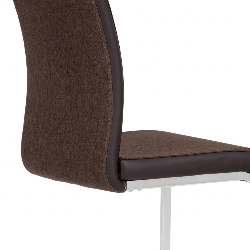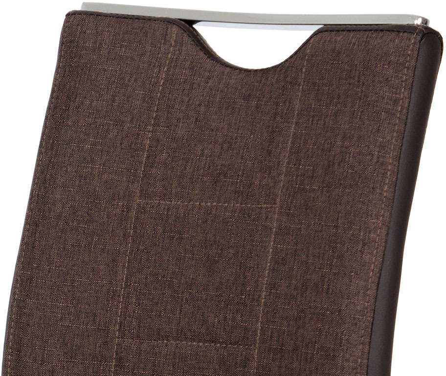 Moderní jídelní židle s dekorativně prošitým opěrákem je očalouněná hnědou látkou v kombinaci s koženkou. Pochromované madlo a pohupová podnož mají obdélníkový průřez. Praktické madlo zajistí snadnou manipulaci a přemístění židle. Nosnost do 110 kg.