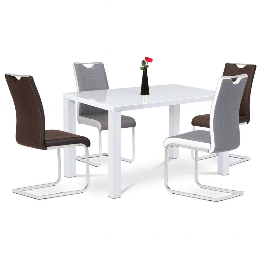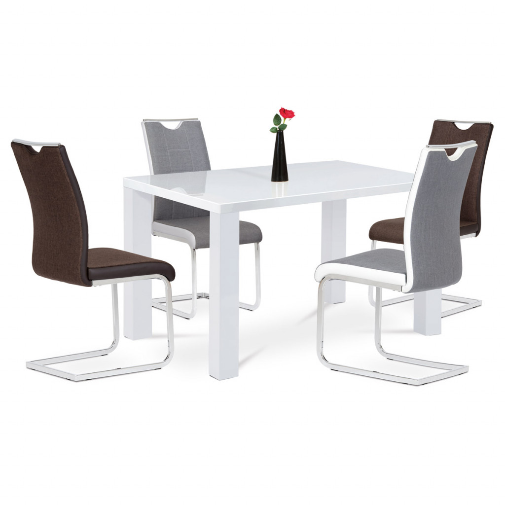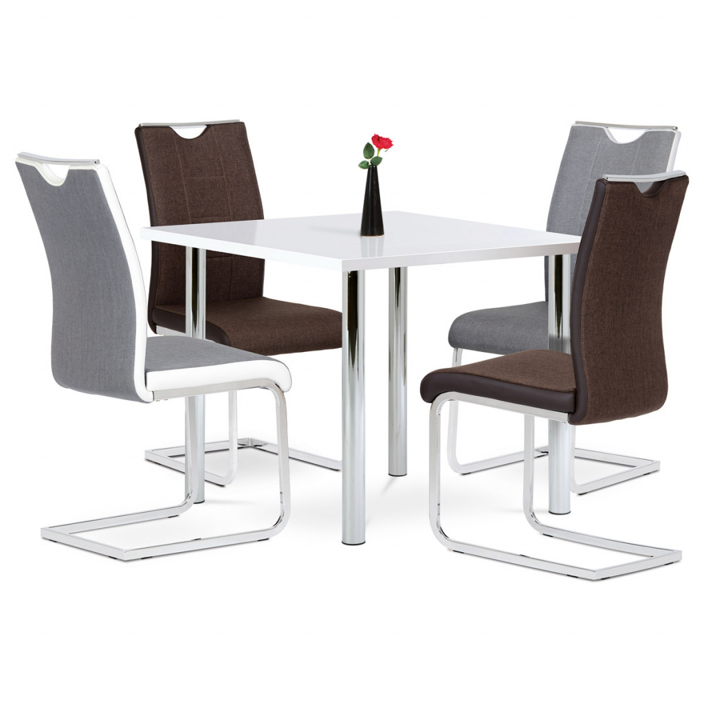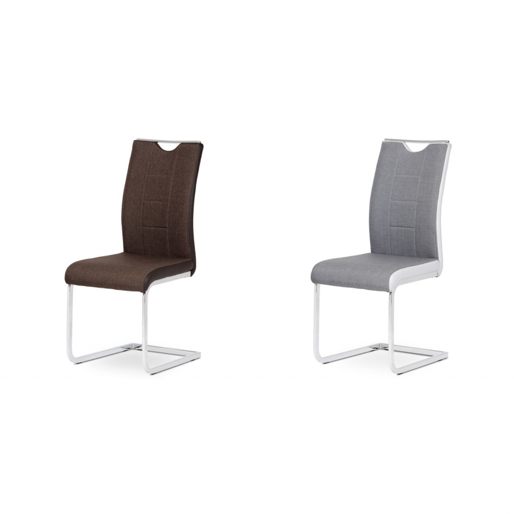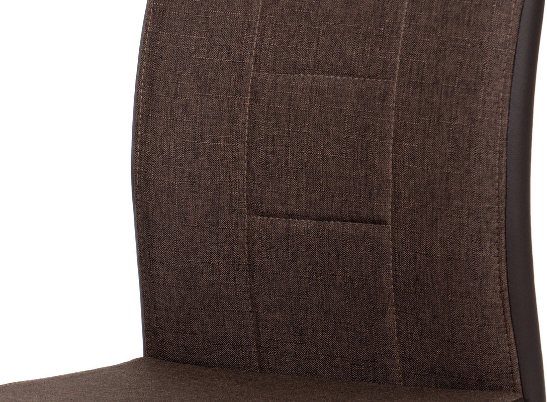 Moderní jídelní židle s dekorativně prošitým opěrákem je očalouněná hnědou látkou v kombinaci s koženkou. Pochromované madlo a pohupová podnož mají obdélníkový průřez. Praktické madlo zajistí snadnou manipulaci a přemístění židle. Nosnost do 110 kg.