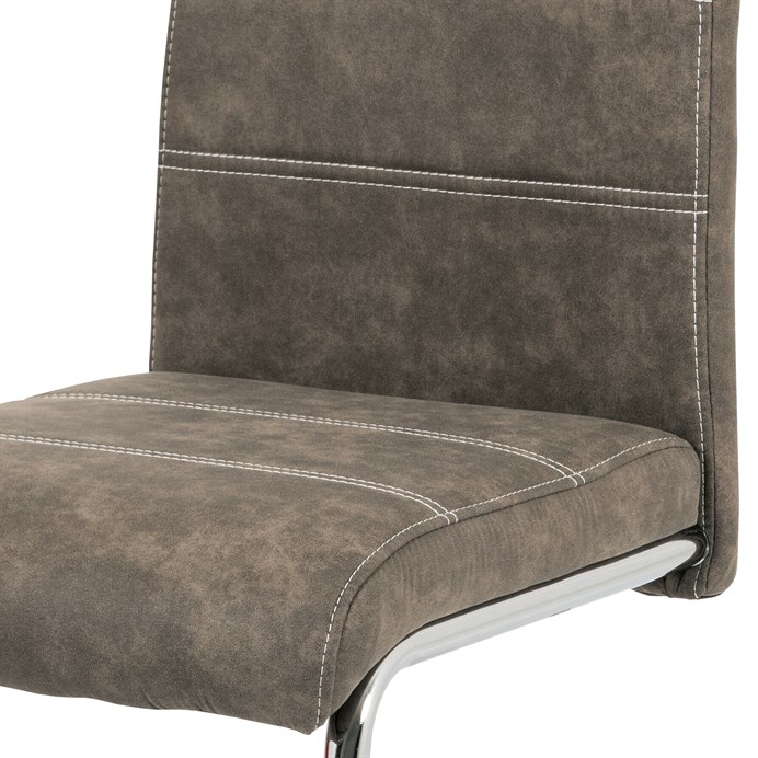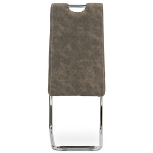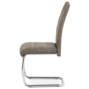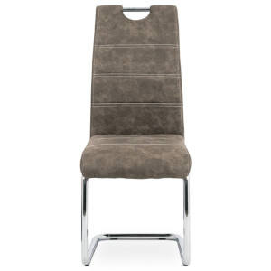 Jídelní židle s označením HC-483 BR3 nabízí potah z hnědé látky v dekoru vintage kůže, která kombinuje estetiku tradičního vzhledu s praktičností textilního materiálu. Pevná chromovaná kovová podnož je navržena v pohupovém provedení, které přispívá k příjemnému sezení a mírnému odpružení. Sedák i opěradlo jsou ergonomicky tvarované a čalouněné pro komfort během delšího posezení. Židle nemá područky ani možnost výškového nastavení, což ji činí vhodnou především pro jídelní prostory s omezeným prostorem. Stabilní kovová konstrukce zajišťuje nosnost odpovídající běžnému užívání v domácnostech i komerčních provozech.