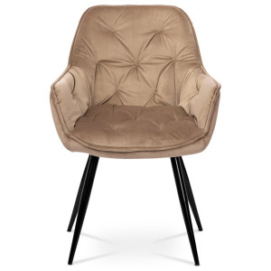 Jídelní židle s označením DCH-421 CAP4 nabízí komfortní sezení díky čalounění z měkké sametové látky v cappuccino odstínu, která je doplněna designovým prošitím pro zvýraznění estetického dojmu. Pevná čtyřnohá podnož z kovu s černým lakem zajišťuje stabilitu a dlouhou životnost. Opěradlo i sedák jsou ergonomicky tvarované a vybavené područky přispívají k pohodlí při delším posezení. Sametový potah je příjemný na dotek a snadno se udržuje, což ocení každý uživatel. Židle je vhodná do moderních i klasických interiérů, kde vynikne její kombinace elegance a funkčnosti.