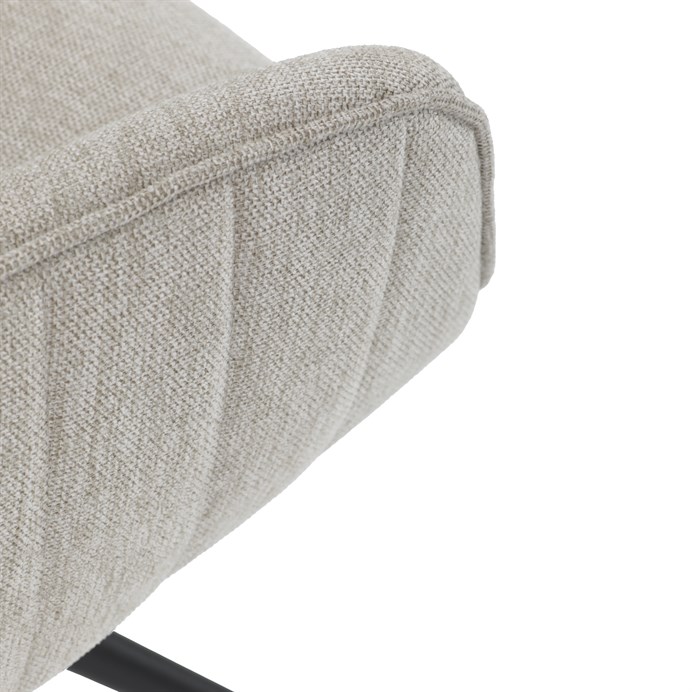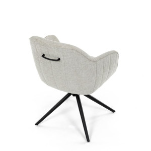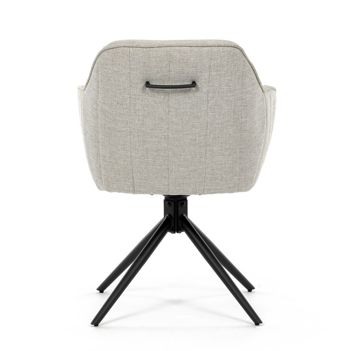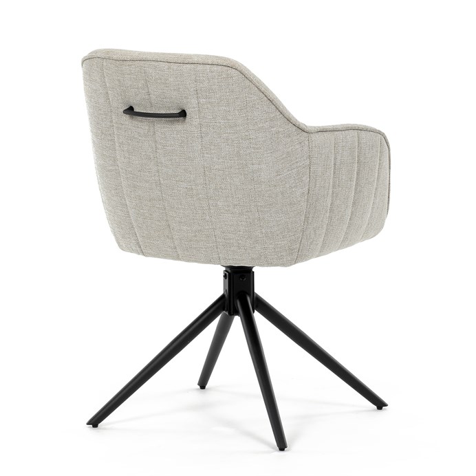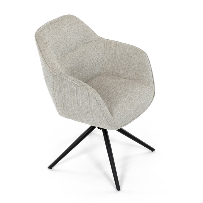 Moderní jídelní židle v krémové barvě s efektním prošitím zádové i přední části opěráku. Prošití je v brvě potahového materiálu. Zadní část opěráku je opatřena vkusným madlem pro snazší manipulaci. Čtyři kovové nohy v matném práškovém nástřiku vycházejí z centrálního bodu ve středu sedáku. Sedák je otočný o P90°+ L 90° s vratným mechanismem - funkce reset.