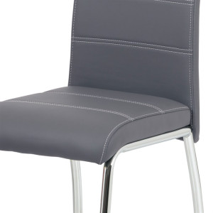 Jídelní židle s potahem z šedé ekokůže je doplněna výrazným bílým prošitím, které podtrhuje její moderní design. Čalouněný sedák a opěradlo poskytují pohodlné sezení, zatímco pevné kovové nohy s chromovaným povrchem zajišťují stabilitu a dlouhou životnost. Židle nemá područky ani možnost výškového nastavení, což ji činí kompaktní a snadno kombinovatelnou s různými typy jídelních stolů. Praktický otvor v horní části opěradla usnadňuje manipulaci a přenášení. Celková konstrukce je navržena tak, aby nabízela komfort i odolnost při každodenním používání.