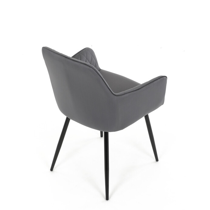 Jídelní židle s potahem z šedé sametové látky nabízí příjemný dotek a vizuálně zajímavý design díky prošívání v kosočtverečném vzoru na opěradle i područkách. Pevné kovové nohy v černém matném provedení zajišťují stabilitu a dlouhou životnost. Ergonomicky tvarované opěradlo s integrovanými područkami podporuje pohodlné sezení během delších jídel i setkání. Sedák je dostatečně široký a vyplněný měkkou výplní, která přispívá k pohodlí. Židle je vhodná do moderních i klasických interiérů, kde vynikne její kombinace sametu a kovu.
