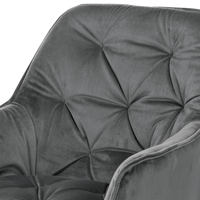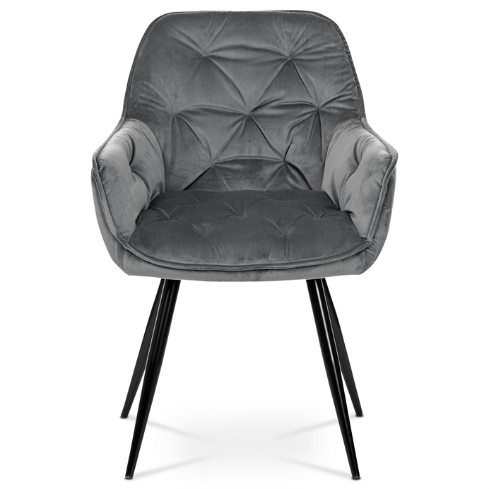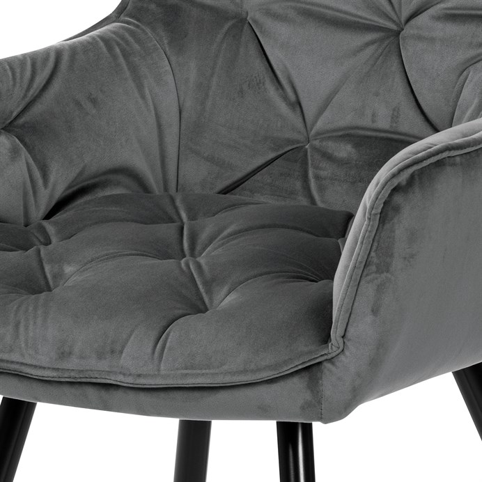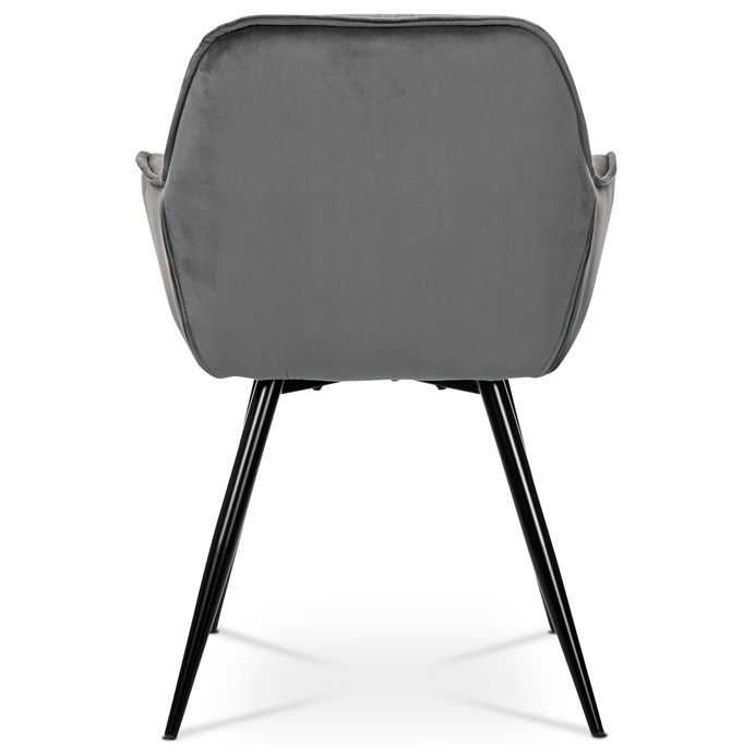 Jídelní židle s označením DCH-421 GREY4 nabízí pohodlné sezení díky čalounění z šedé sametové látky, která je příjemná na dotek a snadno se udržuje. Sedák i opěradlo jsou doplněny designovým prošitím, které podtrhuje moderní vzhled židle. Pevná čtyřnohá podnož z kovu s černým lakem zajišťuje stabilitu a dlouhou životnost. Židle je vybavena integrovanými područkami, které přispívají k většímu komfortu při sezení. Díky svým rozměrům a konstrukci je vhodná pro použití v jídelnách i dalších obytných prostorách.