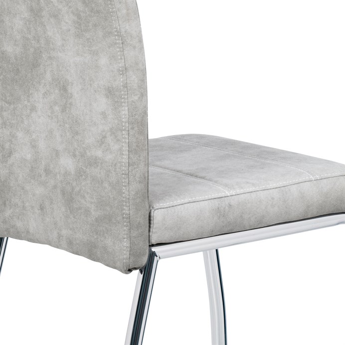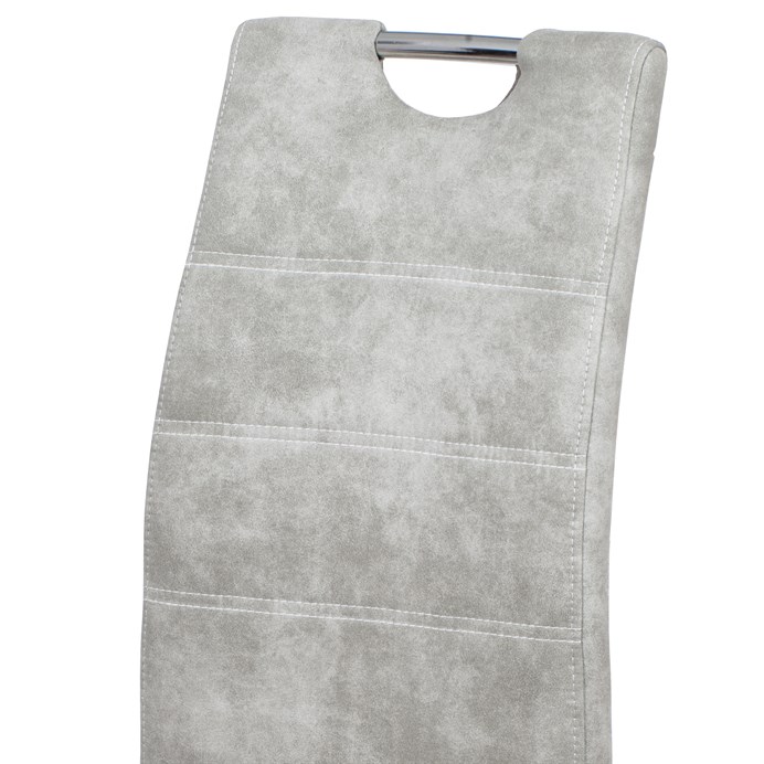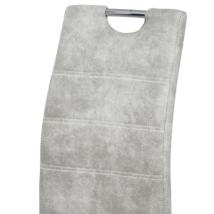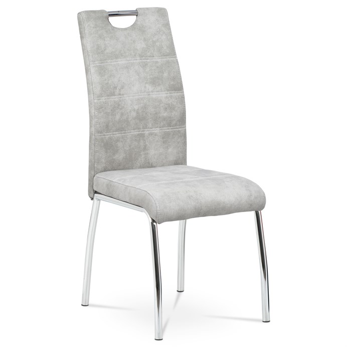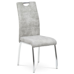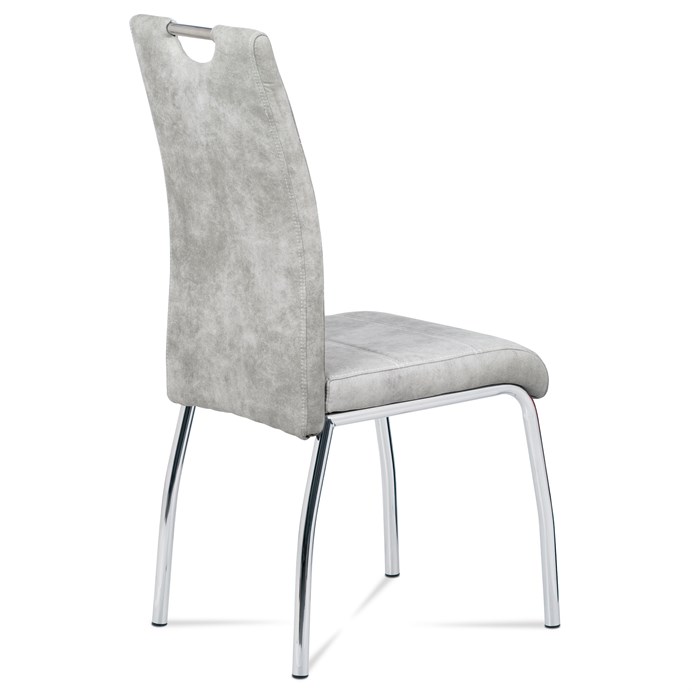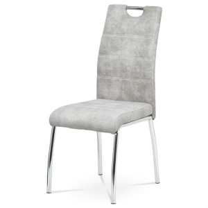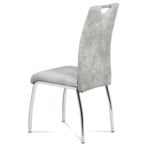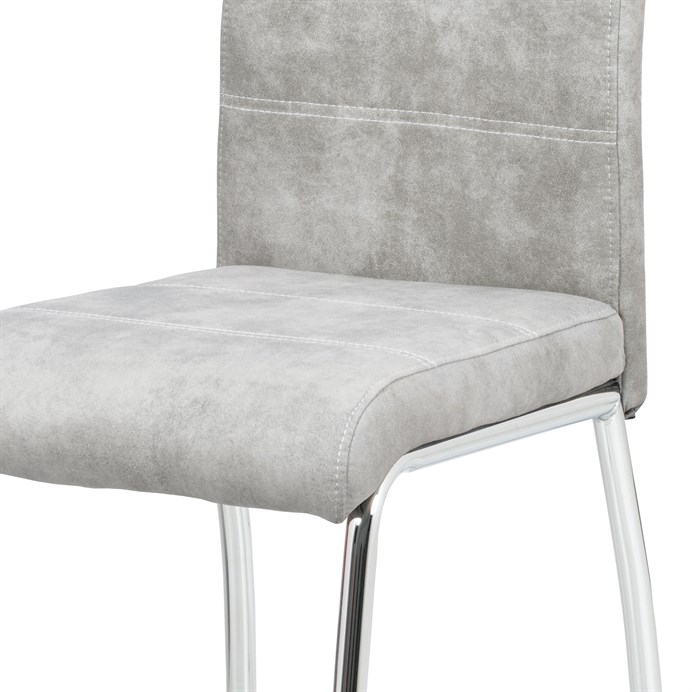 Jídelní židle s označením HC-486 SIL3 nabízí kombinaci moderního designu a praktického provedení. Potah je z kvalitní látky v odstínu stříbrné s efektem vintage kůže, která dodává židli charakter a snadnou údržbu. Čalouněné sedadlo a opěradlo jsou ergonomicky tvarované pro pohodlné sezení během jídel i delších posezení. Stabilní kovová čtyřnohá podnož s chromovaným povrchem zajišťuje pevnost a stabilitu celé židle. Židle nemá područky ani výškové nastavení, což umožňuje snadné zasunutí pod stůl a úsporu místa v prostoru.