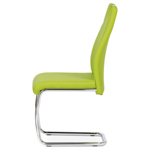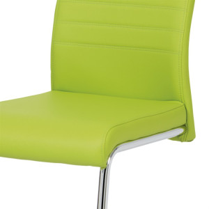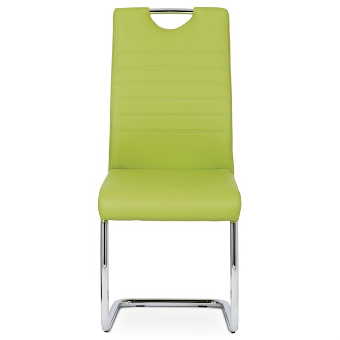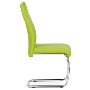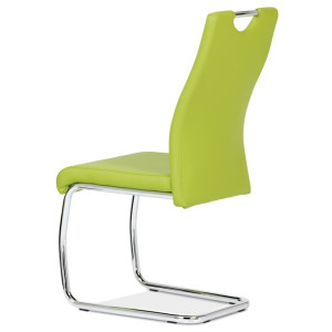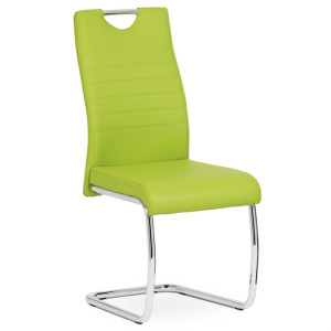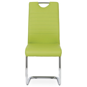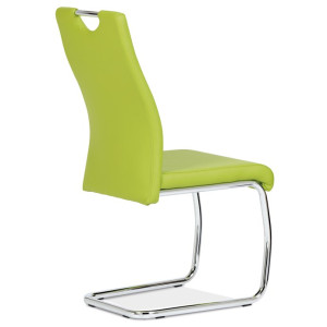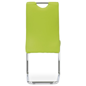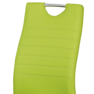Jídelní židle s označením DCL-418 LIM nabízí moderní design v zelené barvě s potahem z ekokůže, který je příjemný na dotek a snadno se udržuje. Pevná kovová podnož v chromovaném provedení je tvarovaná do stabilní pohupové konstrukce, která zajišťuje mírný pohyb při sezení a přispívá k pohodlí. Sedák i opěradlo jsou ergonomicky tvarované a čalouněné pro komfortní posezení během delších jídel či setkání. Židle nemá područky ani otočný mechanismus, což ji činí vhodnou do menších prostor i k jídelním stolům s úzkým prostorem. Celková nosnost a rozměry odpovídají standardům pro běžné domácí použití.