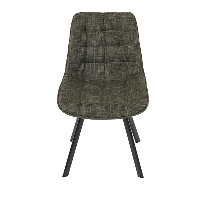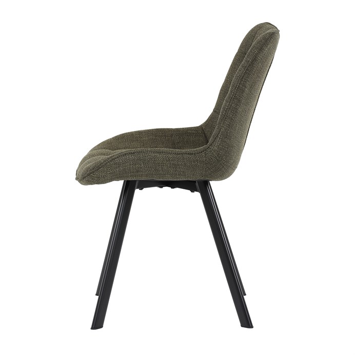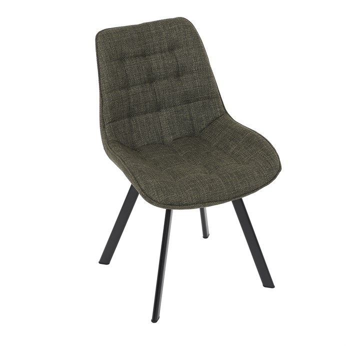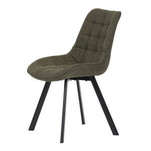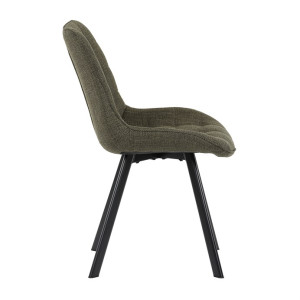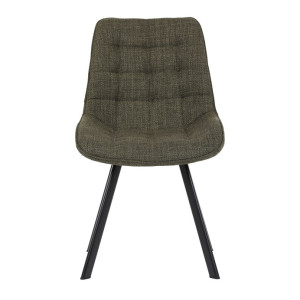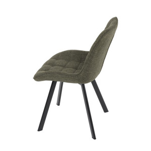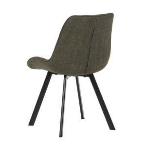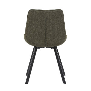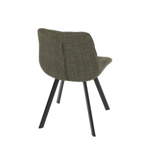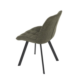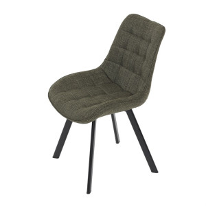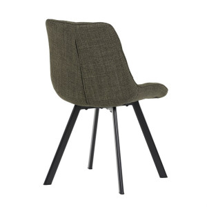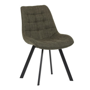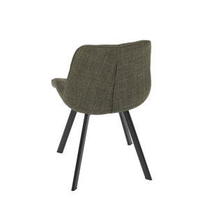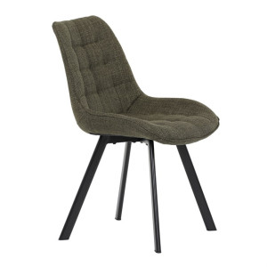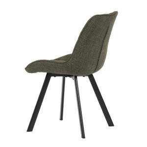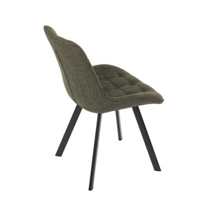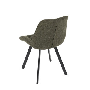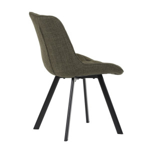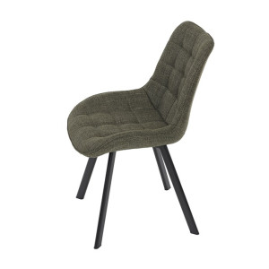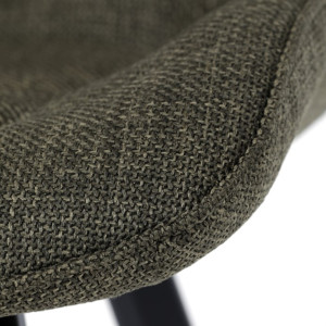 Židle je vyrobena s důrazem na detail. Je čalouněna kvalitní temně zelenou látkou, která je měkká na dotek a odolná proti opotřebení. Ergonomický tvar a polstrování zajišťují komfort i při delším sezení. Židle má 4 kovové nohy s černým povrchem, které poskytují stabilitu a trvanlivost. Nohy jsou mírně skloněné pro lepší rovnováhu a moderní vzhled.