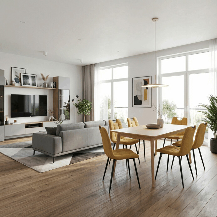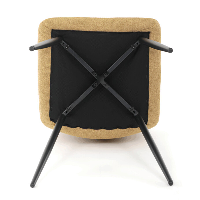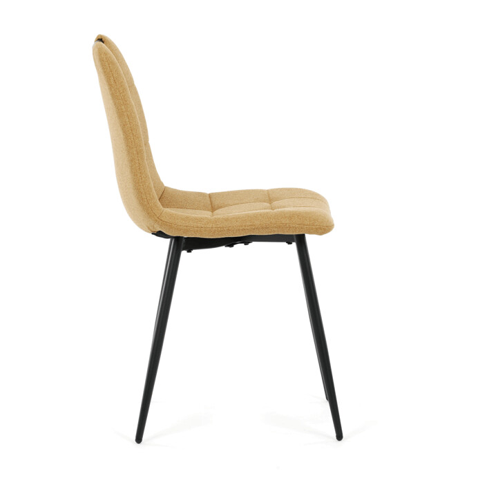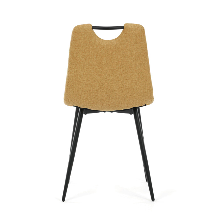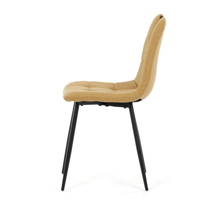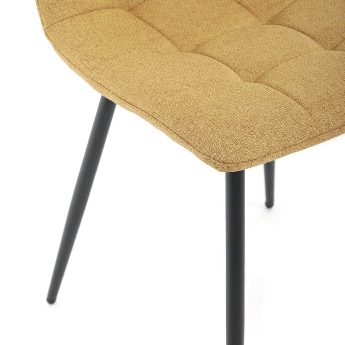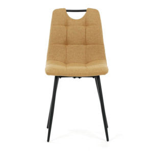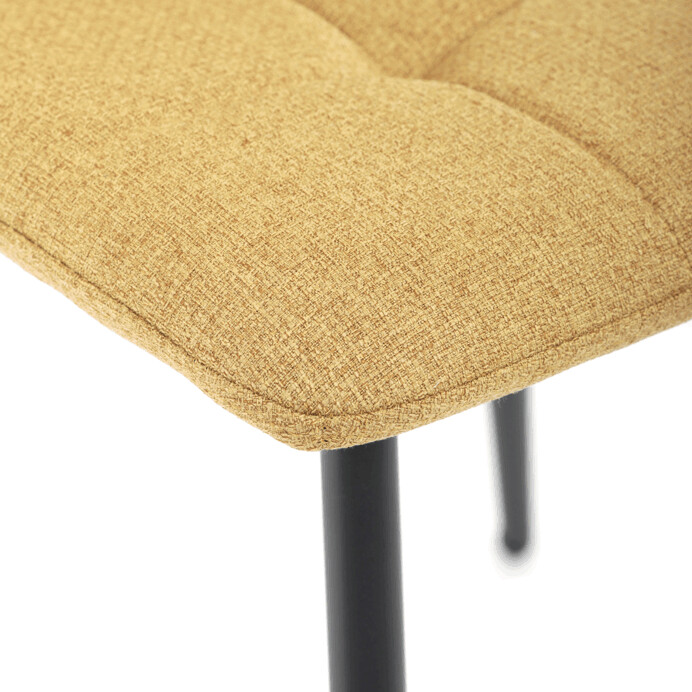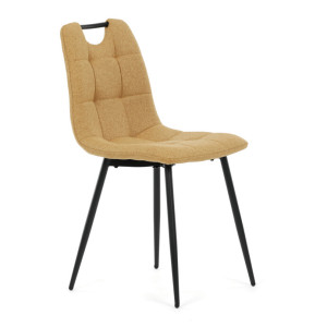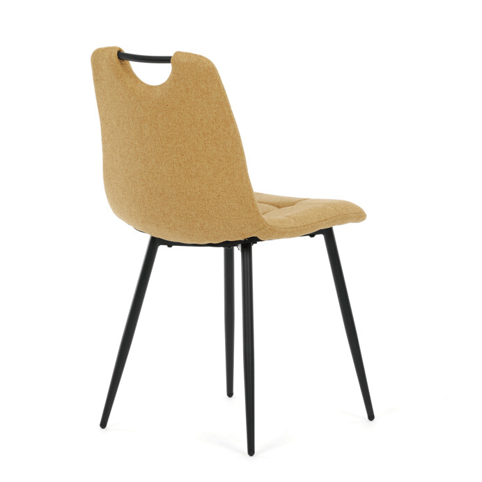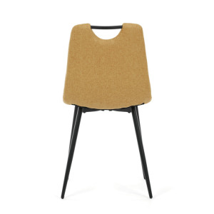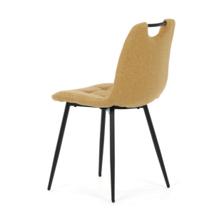 Jídelní židle s označením DCL-V2017 YEL2 kombinuje moderní design s praktickými vlastnostmi. Sedák a opěradlo jsou potaženy žlutou látkou, která je snadno udržovatelná a doplněná designovým prošitím pro zvýraznění estetického dojmu. Černě matné kovové nohy zajišťují stabilitu a pevnost celé židle, zatímco integrované madlo v horní části opěradla usnadňuje manipulaci a přenášení. Židle nemá područky ani otočný mechanismus, což podporuje jednoduchost a kompaktnost. Díky kvalitnímu zpracování a použitým materiálům je vhodná pro každodenní použití v jídelnách i komerčních prostorách.