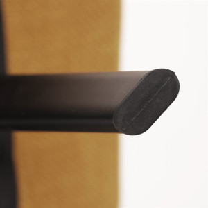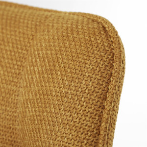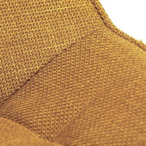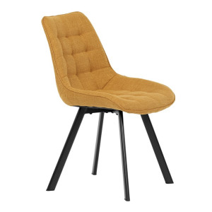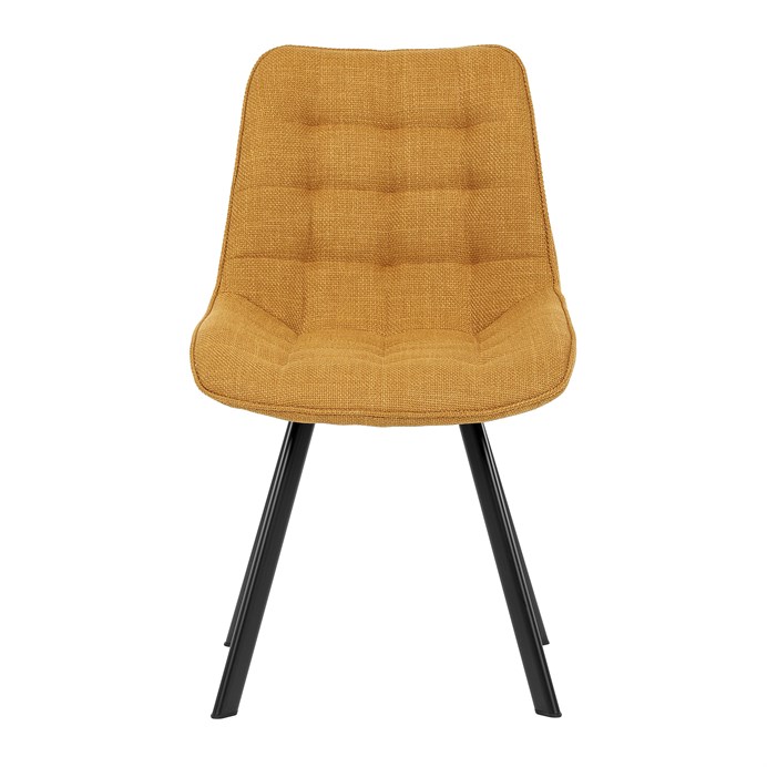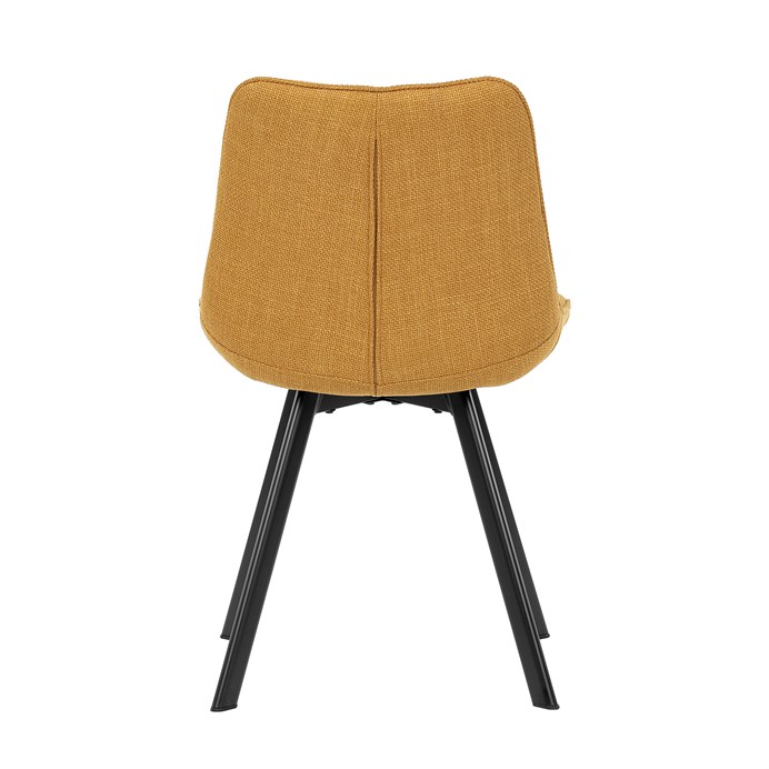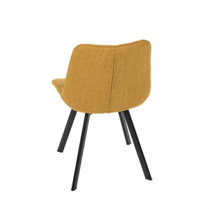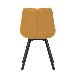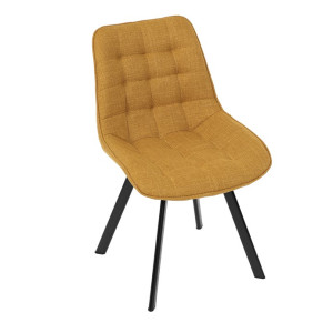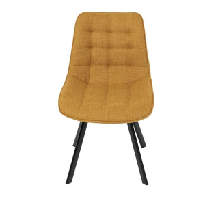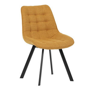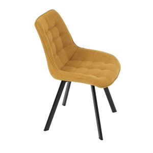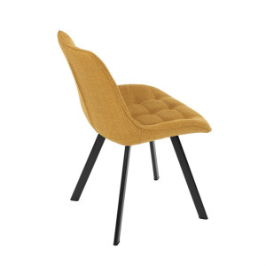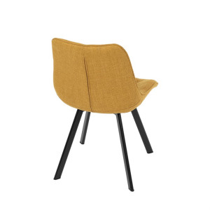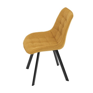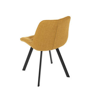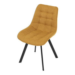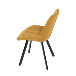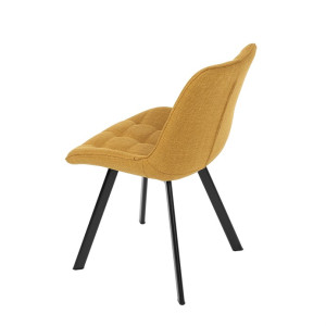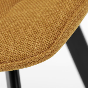 Židle je vyrobena s důrazem na detail. Je čalouněna kvalitní žlutou látkou, která je měkká na dotek a odolná proti opotřebení. Ergonomický tvar a polstrování zajišťují komfort i při delším sezení. Židle má 4 kovové nohy s černým povrchem, které poskytují stabilitu a trvanlivost. Nohy jsou mírně skloněné pro lepší rovnováhu a moderní vzhled.