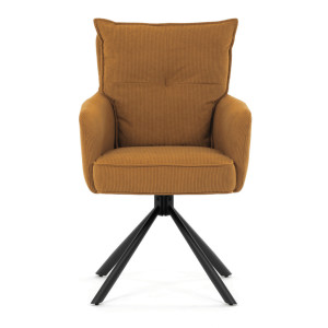 Jídelní židle s označením HC-X1128 YEL2 nabízí komfortní sezení díky vysokému polstrování sedáku a opěradla potažených žlutou manšestrovou látkou, která je příjemná na dotek a snadno se udržuje. Sedák je vybaven taštičkovými pružinami, které zvyšují pohodlí a přispívají k dlouhodobé elasticitě. Židle disponuje otočnou funkcí s možností otáčení o 180° a vratným mechanismem reset, který automaticky vrací židli do výchozí polohy, což usnadňuje manipulaci a zvyšuje ergonomii. Pevné černé kovové nohy zajišťují stabilitu a odolnost, přičemž jejich design dodává židli moderní vzhled vhodný do různých interiérů. Područky jsou integrované v čalounění, což podporuje pohodlné opření rukou během sezení.