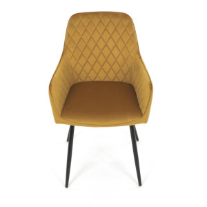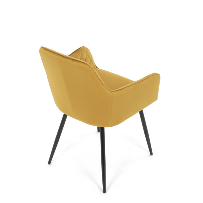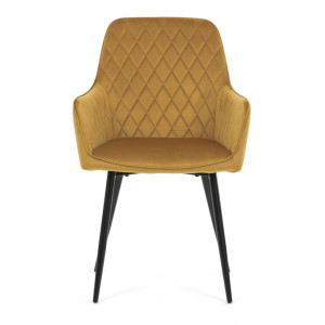 Jídelní židle s označením DCH-215 YEL4 nabízí pohodlné sezení díky čalounění z měkké žluté sametové látky, která je doplněna designovým prošitím v kosočtverečném vzoru na opěradle a područkách. Pevné kovové nohy v černém matném provedení zajišťují stabilitu a dlouhou životnost židle. Ergonomicky tvarované opěradlo s integrovanými područkami podporuje správné držení těla během stolování. Sametová látka je příjemná na dotek a snadno se udržuje, což přispívá k praktickému využití v domácnostech i komerčních prostorách. Židle není otočná, její jednoduchý a zároveň stylový design ji předurčuje k využití v moderních interiérech.
