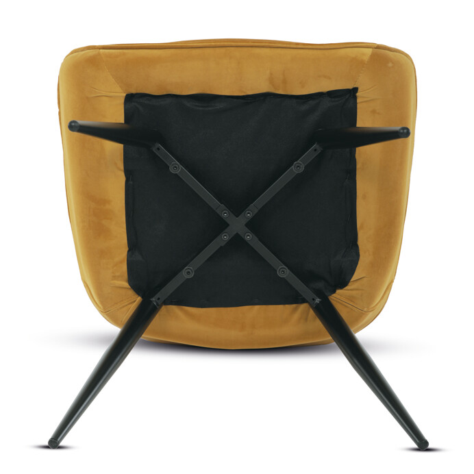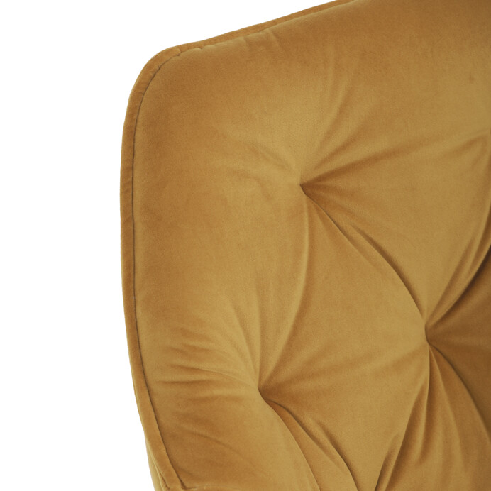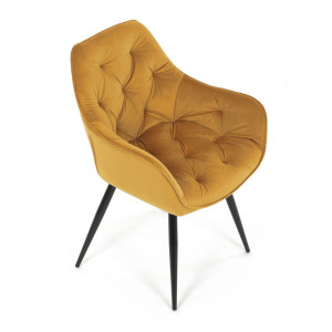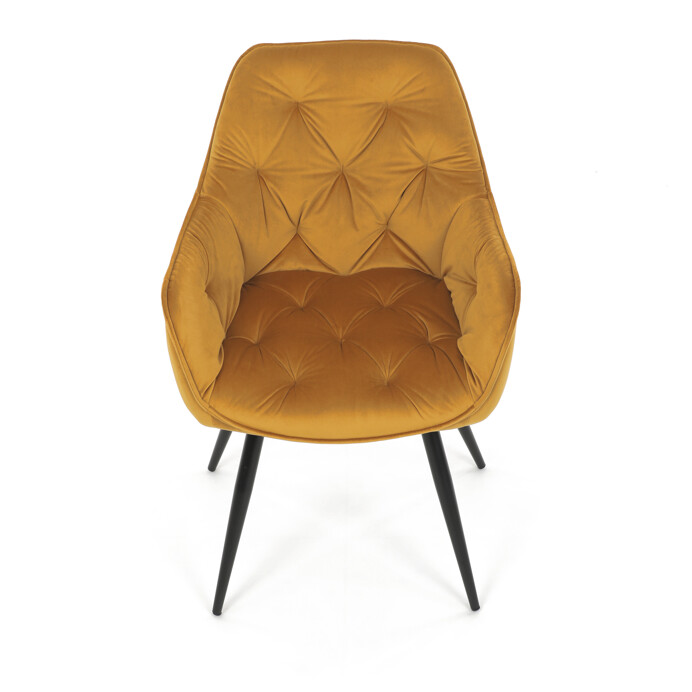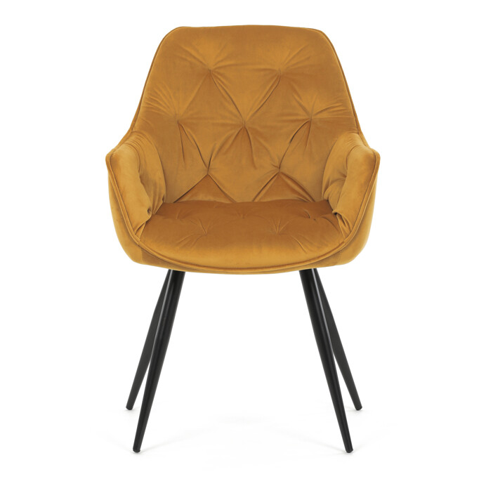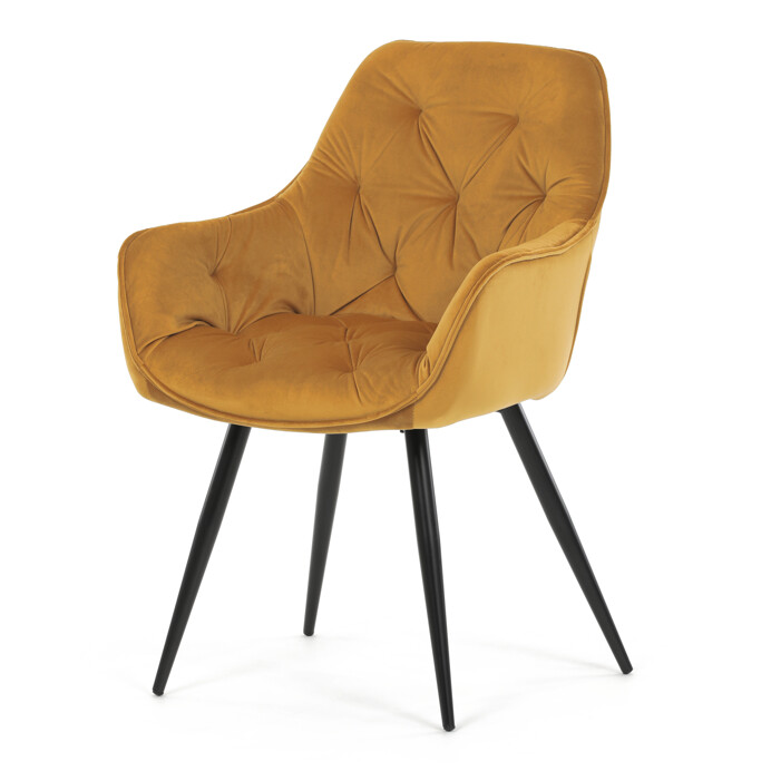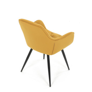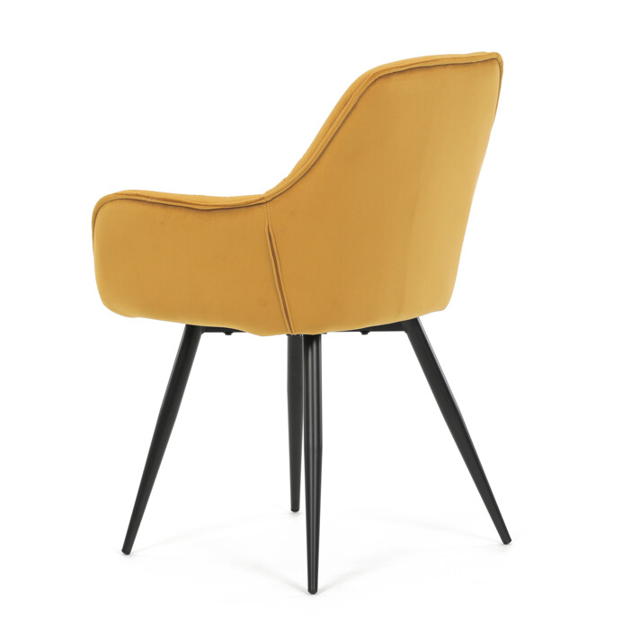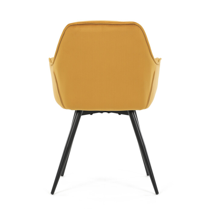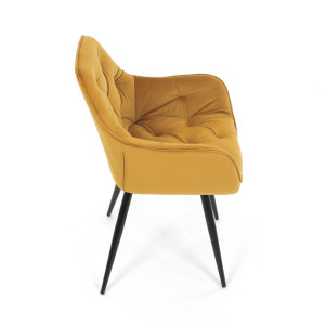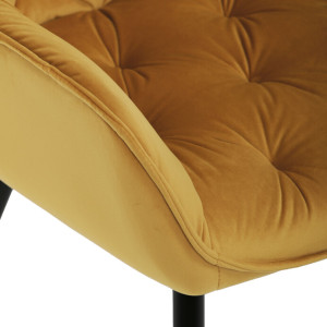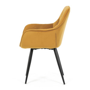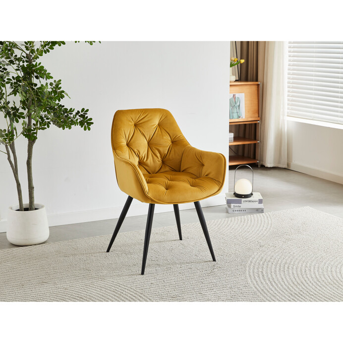 Jídelní židle s čalouněním v žluté sametové látce nabízí pohodlné sezení díky měkkému polstrování a ergonomicky tvarovaným područkám. Designové prošití na opěradle a sedáku dodává židli stylový vzhled a zároveň zvýrazňuje její elegantní profil. Pevná kovová čtyřnohá podnož s matným černým lakem zajišťuje stabilitu a dlouhou životnost. Židle je určena pro použití v jídelnách i moderních interiérech, kde vynikne její výrazná barva i kvalitní zpracování. Nenáročná údržba látky a robustní konstrukce podporují každodenní komfort a funkčnost.