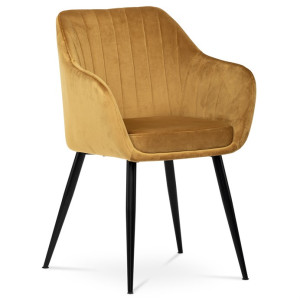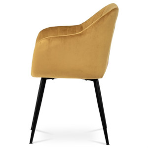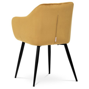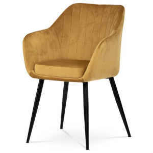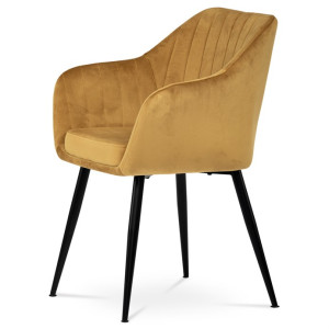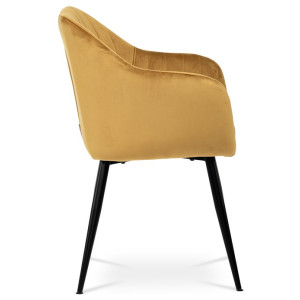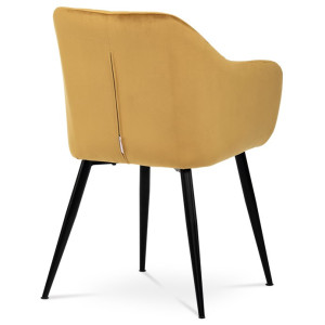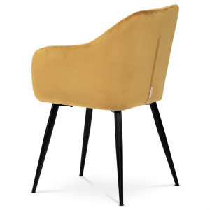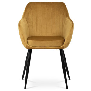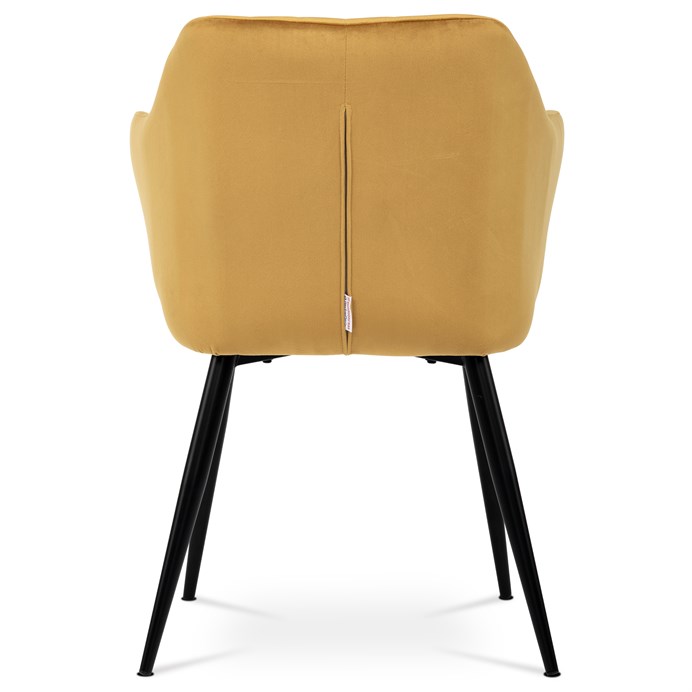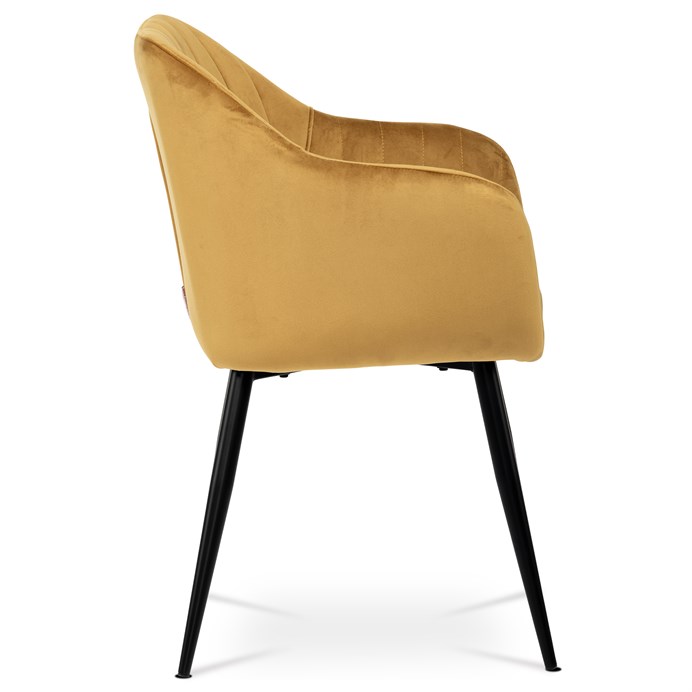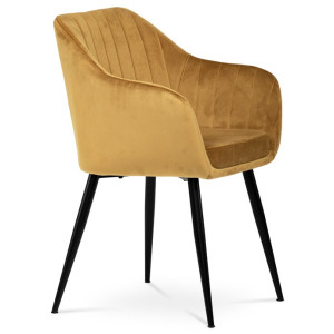 Dokonalý design, industriální styl a perfektní pohodlí je pro tuto židli samozřejmostí. Skořepina sedáku i opěradla má pevnou kovovou kostru, potah z velmi kvalitní sametové látky v matném provedení a ve velmi žádaném odstínu hořčicově žluté. Polstrování je z PU pěny. Bonusem ke zvýšení pohodlí posedu je 8 cm zvýšený a extra polstrovaný sedák a praktické pohodlné opěrky s opěrnou plochou ve výšce 69 cm od podlahy. Příjemný dekorativní prvek vytvářejí svislá prošití vnitřních částí opěradla i boků. Použitá látka je velmi odolná a perfektně se čistí.