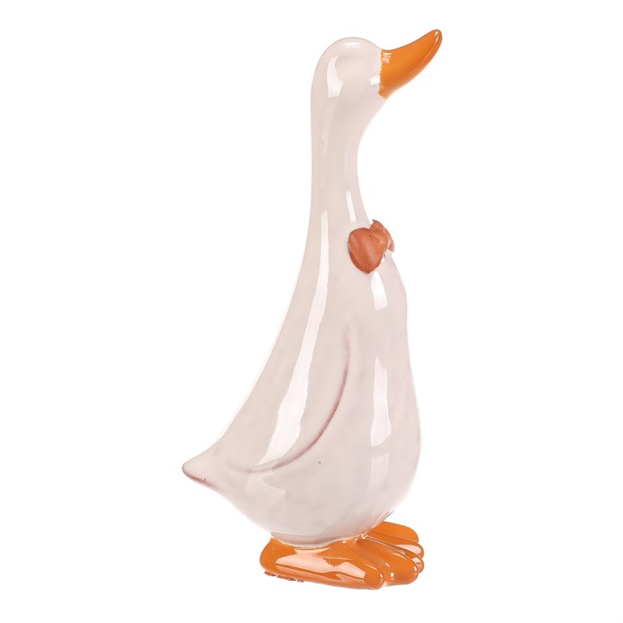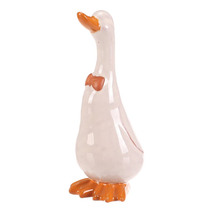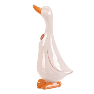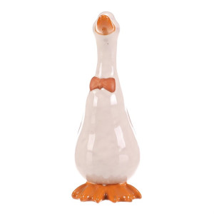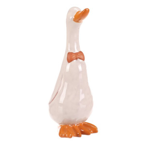 Dotaz na produktKeramická figurka kachny ve střední velikosti zaujme svým bílým lesklým povrchem a oranžovými detaily na zobáku, mašličce a nožkách. Je určena k postavení a díky pevnému keramickému provedení se snadno udržuje. Stylová dekorace vhodná pro oživení interiérů i zahradních prostor s přírodní tématikou.
