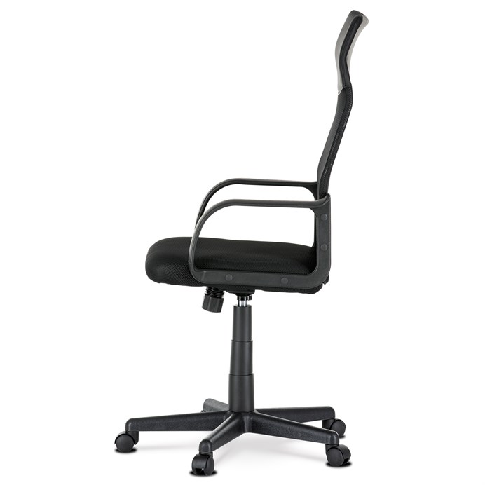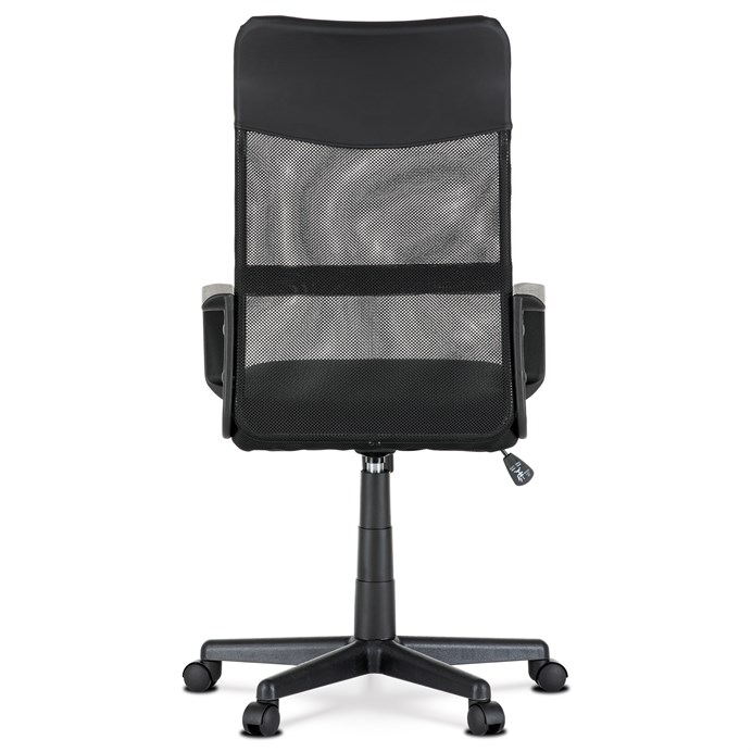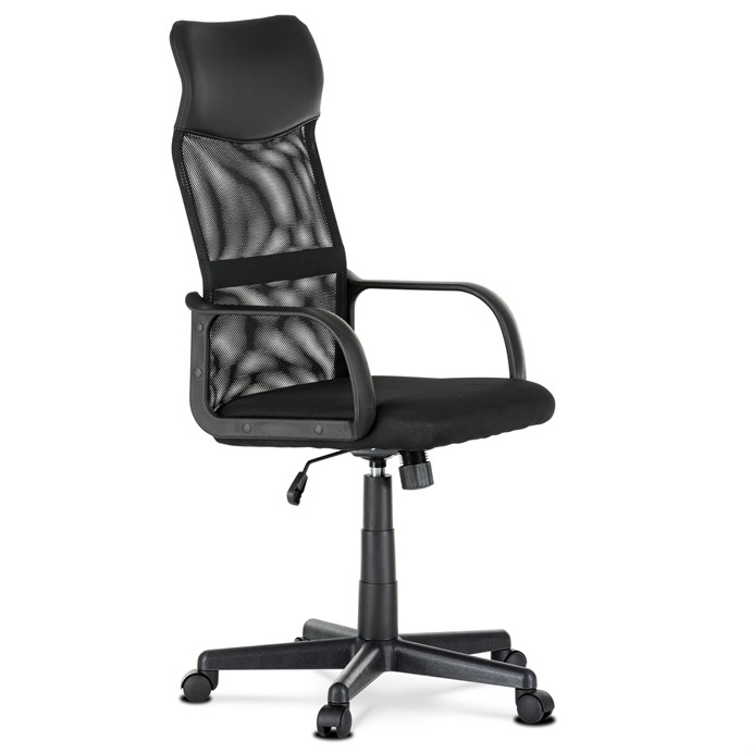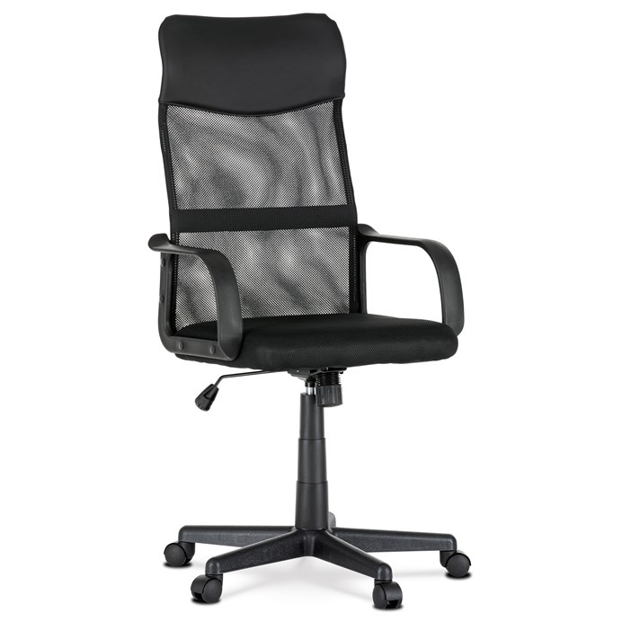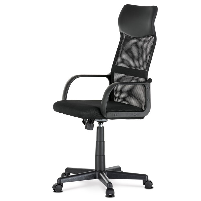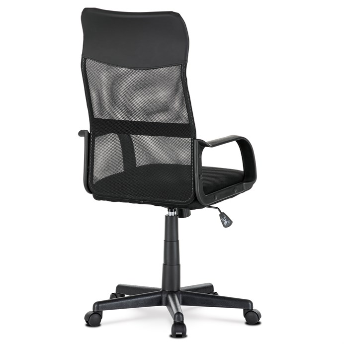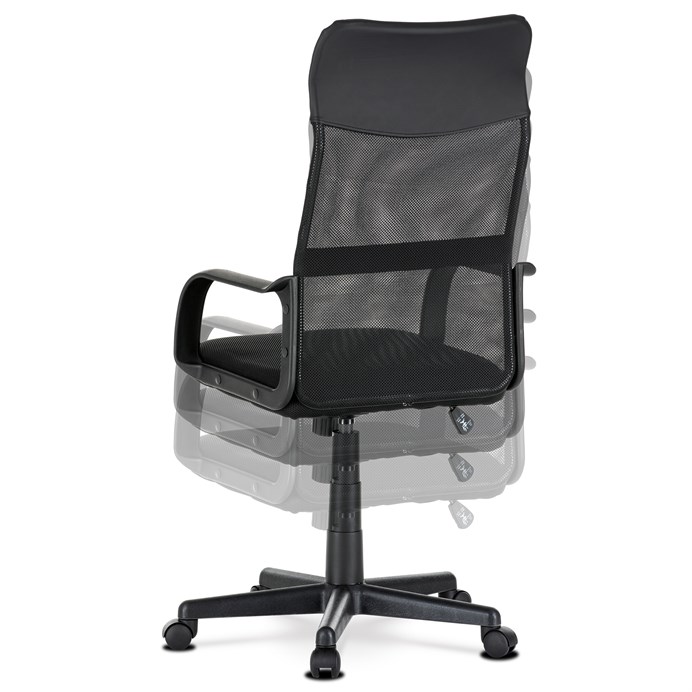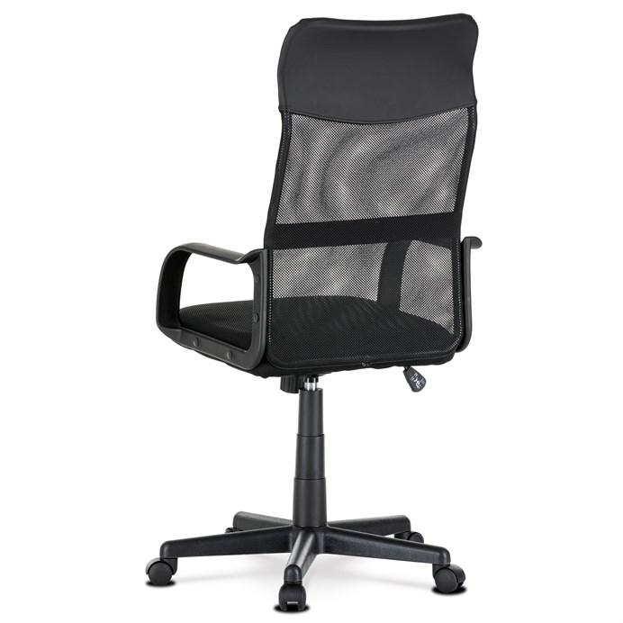 Oblíbená a nadčasová kancelářská židle decentní černé barvy je vhodná nejen do kanceláří, ale například i pro Home office. Vysoký trubkový opěrák s bederní opěrkou je potažen černou síťovinou MESH a v horní části jako podhlavník slouží velmi praktický potah z černé ekokůže. Použité materiály na sedáku i zádové části opěráku zaručují dokonalou prodyšnost. Příjemný polstrovaný sedák je potažený černou látkou MESH. Výplň je v kvalitní PU pěny, která zaručuje příjemné dlouhodobé sezení. Ruce si můžete pohodlně opřít o 6 cm široké černé plastové područky s velkou ložnou plochou 35 cm. Područky zároveň slouží jako velmi pevné spojovací díly sedáku s opěrákem. Díky kvalitnímu plynovému pístu je židle výškově nastavitelná, vybavená houpacím mechanismem a velkým aretačním šroubem na úpravu tuhosti pohupu, který je umístěn pod sedákem. Správnou stabilitu a pevnost zajišťuje pětiramenný černý plastový kříž o pr. 60 cm s plastovými kolečky vhodnými na koberce. Nosnost židle je až 120 kg.