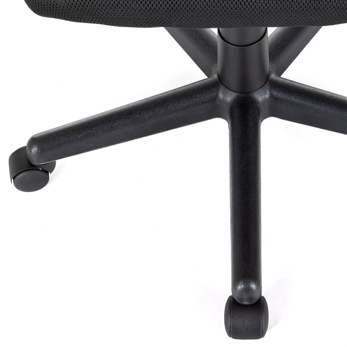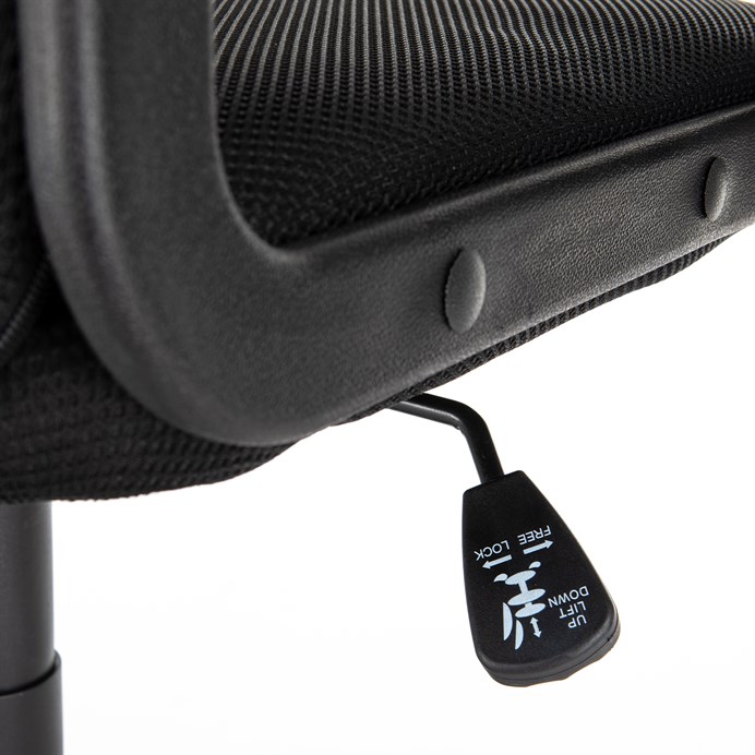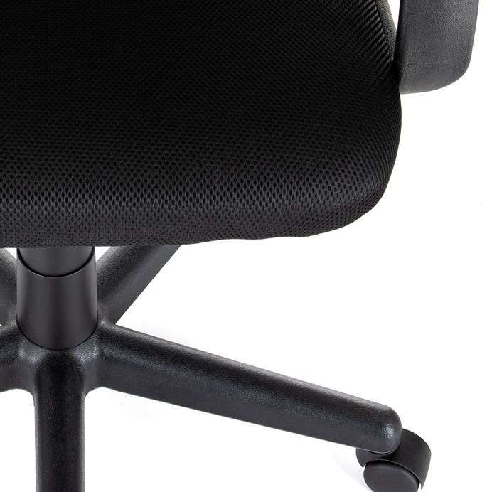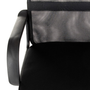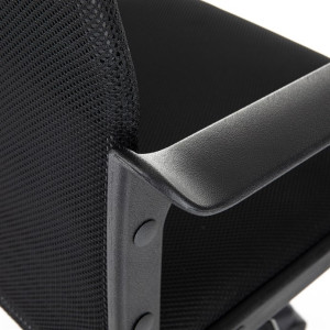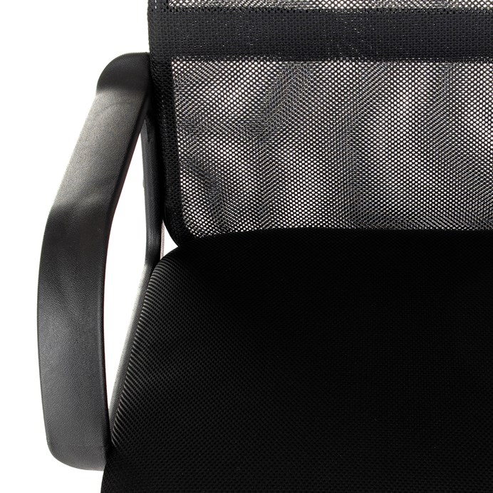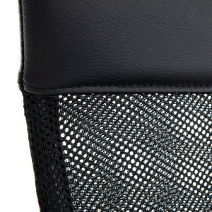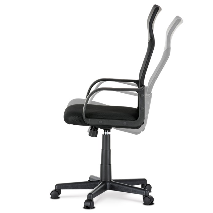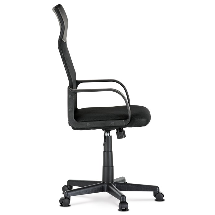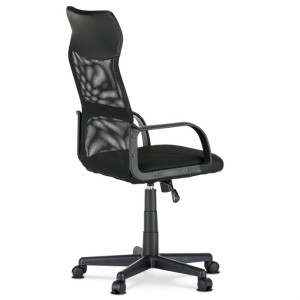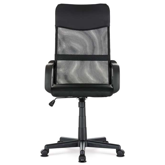 Oblíbená a nadčasová kancelářská židle decentní černé barvy je vhodná nejen do kanceláří, ale například i pro Home office. Vysoký trubkový opěrák s bederní opěrkou je potažen černou síťovinou MESH a v horní části jako podhlavník slouží velmi praktický potah z černé ekokůže. Použité materiály na sedáku i zádové části opěráku zaručují dokonalou prodyšnost. Příjemný polstrovaný sedák je potažený černou látkou MESH. Výplň je v kvalitní PU pěny, která zaručuje příjemné dlouhodobé sezení. Ruce si můžete pohodlně opřít o 6 cm široké černé plastové područky s velkou ložnou plochou 35 cm. Područky zároveň slouží jako velmi pevné spojovací díly sedáku s opěrákem. Díky kvalitnímu plynovému pístu je židle výškově nastavitelná, vybavená houpacím mechanismem a velkým aretačním šroubem na úpravu tuhosti pohupu, který je umístěn pod sedákem. Správnou stabilitu a pevnost zajišťuje pětiramenný černý plastový kříž o pr. 60 cm s plastovými kolečky vhodnými na koberce. Nosnost židle je až 120 kg.