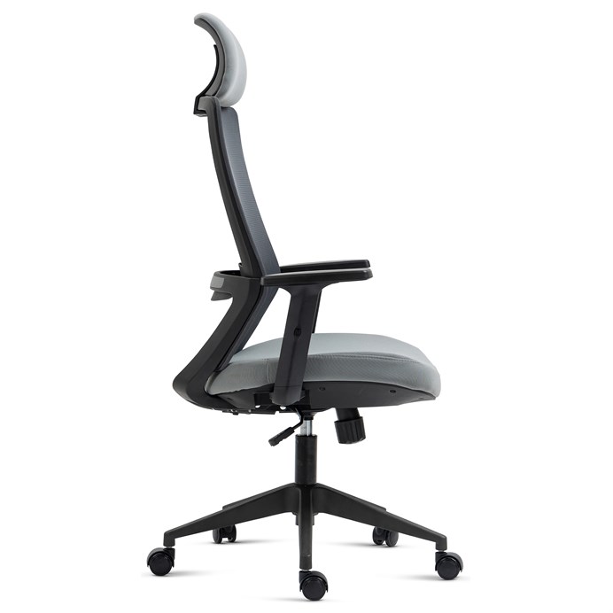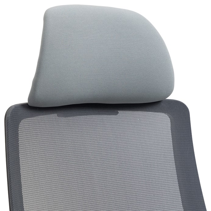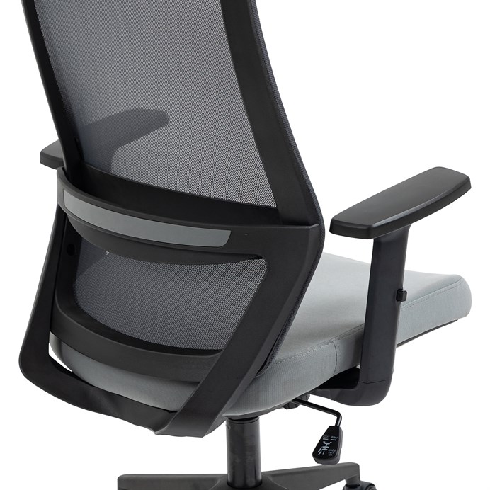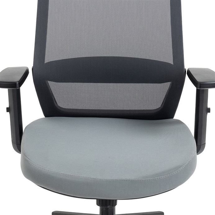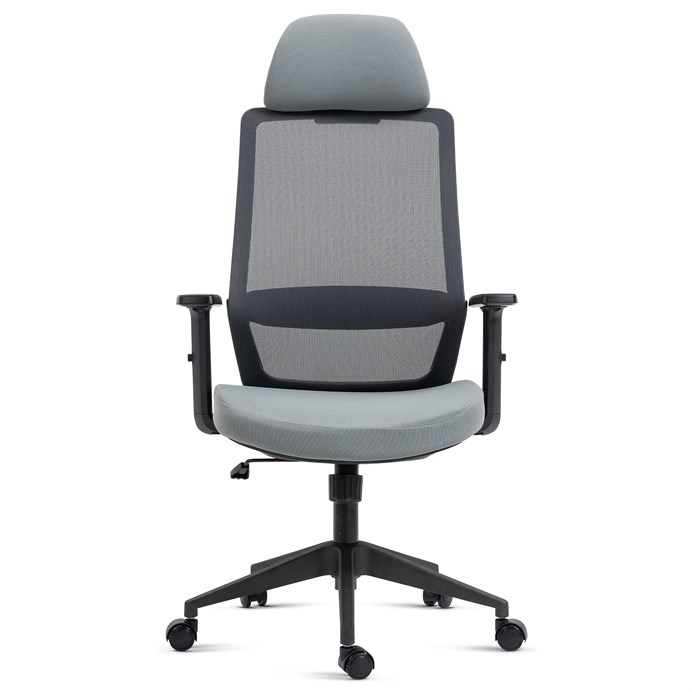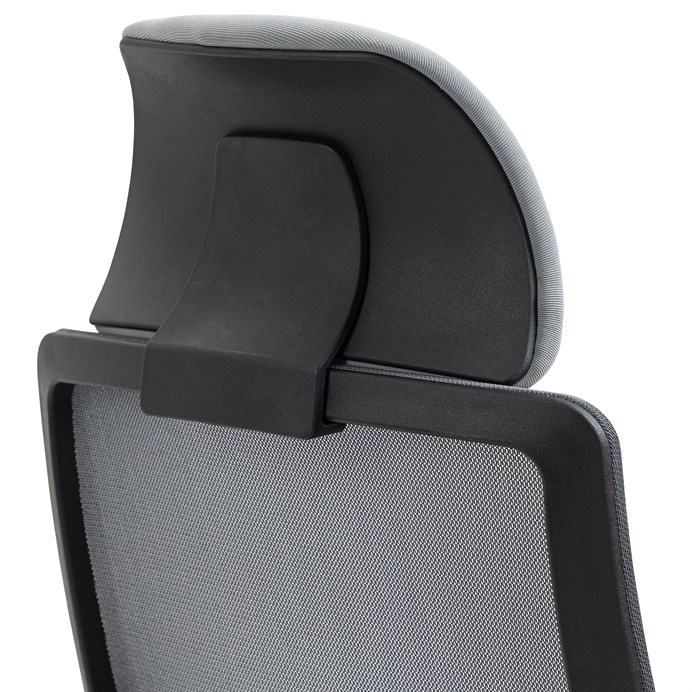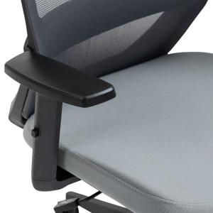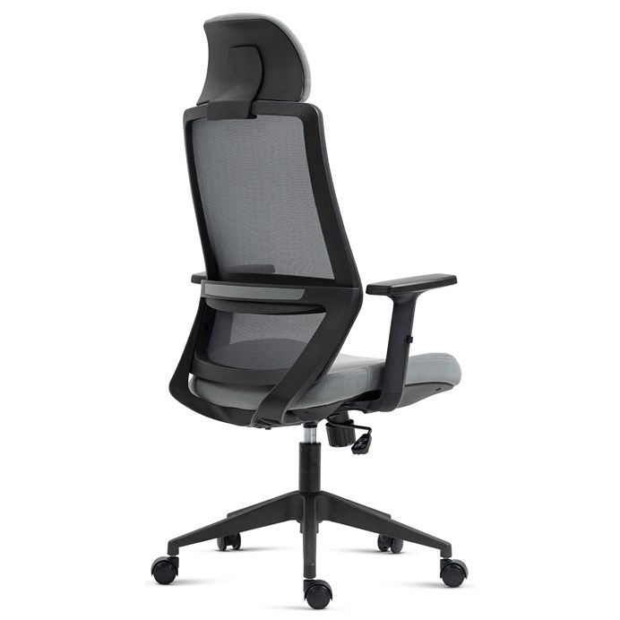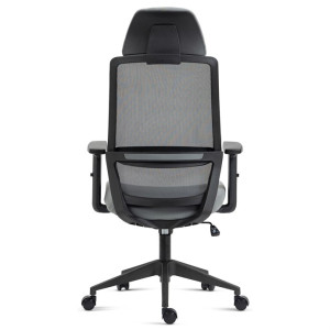 Kancelářská židle s opěrákem v prodyšném materiálu v černé barvě. Pro větší pohodlí má židle měkký sedák v šedé látce, praktický podhlavník a područky s 4D funkcí s vrchní části s měkou PU pěnou. Pohodlný pohup zajistí houpací mechanika s polohovou aretací zádové opěrky. Kříž je zhotoven z odolného plastu v černé barvě
