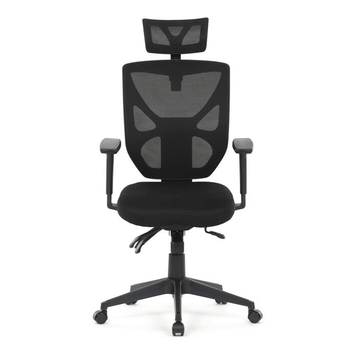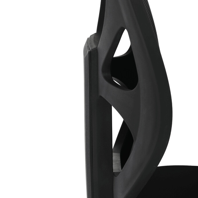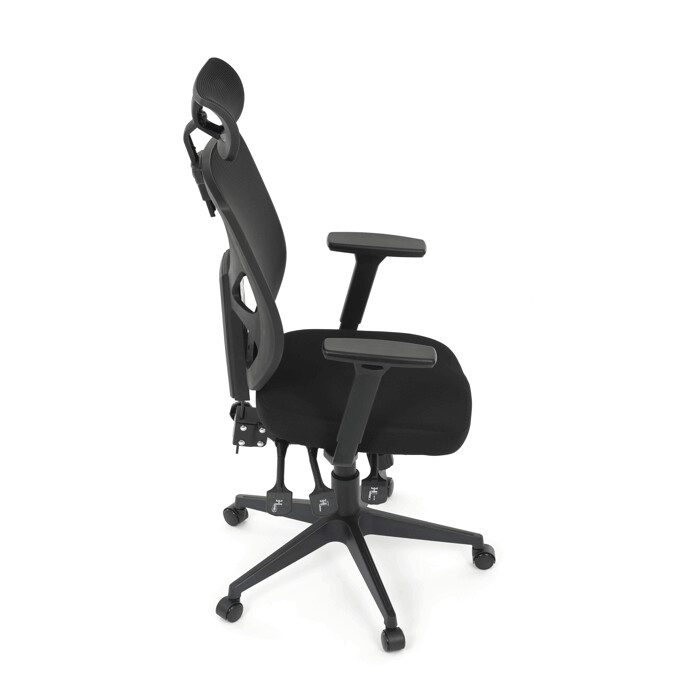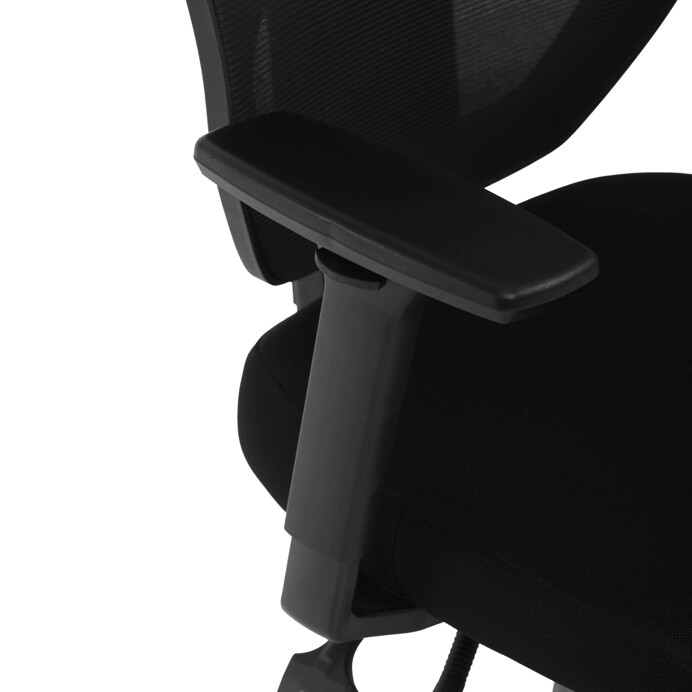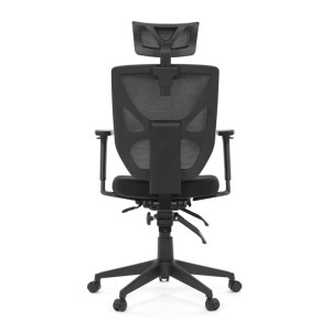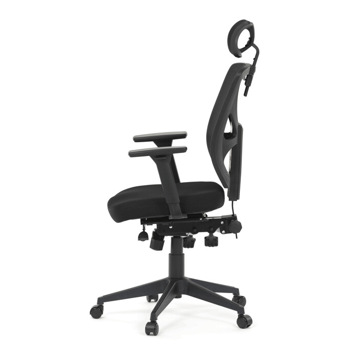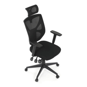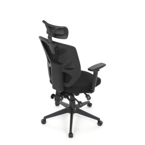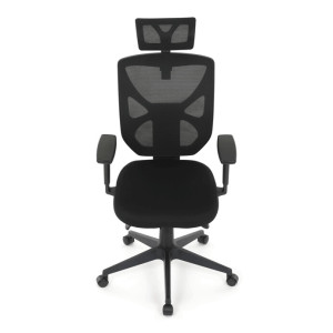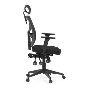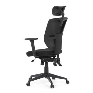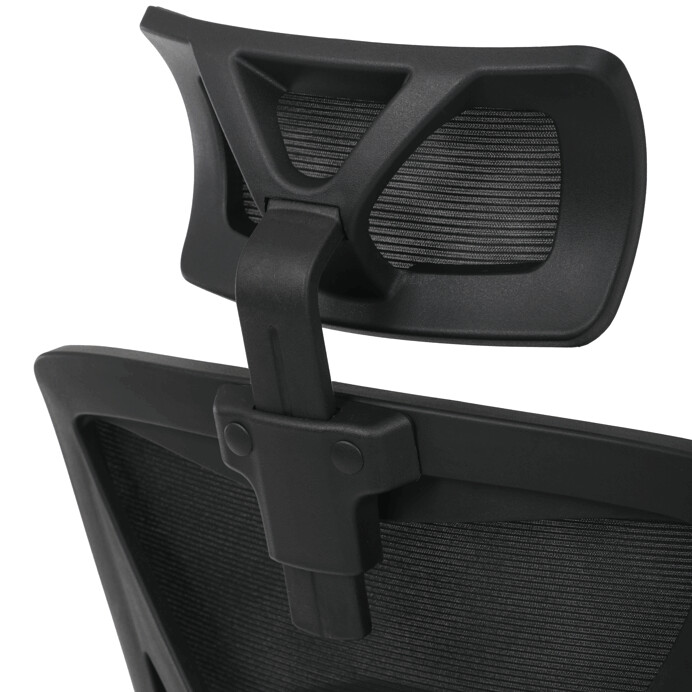 Kancelářská židle s černým mesh potahem nabízí vysoký komfort díky ergonomicky tvarovanému opěradlu a integrované opěrce hlavy, která podporuje správné držení krční páteře. Sedák je vybaven posuvnou funkcí pro individuální nastavení hloubky sezení, což zvyšuje pohodlí při dlouhodobé práci. Synchronní mechanismus umožňuje plynulé naklápění opěradla s možností aretace v několika polohách, čímž přispívá k ergonomii a podpoře správného držení těla. 3D područky lze nastavit ve třech směrech – výškově, do stran i dopředu – pro maximální přizpůsobení uživateli. Plastový kříž zajišťuje stabilitu a lehkost celé židle, která je vhodná pro kancelářské prostředí i domácí pracovny.