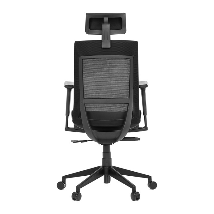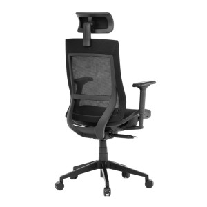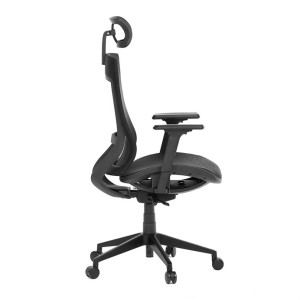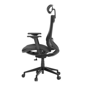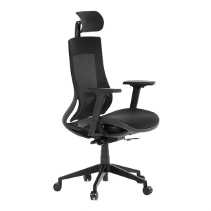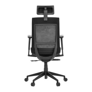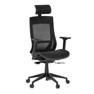 Kancelářská židle v černé síťovině nabízí moderní ergonomii a komfort pro dlouhé hodiny práce. Opěradlo je vybaveno pevnou bederní opěrkou a výškově nastavitelnou hlavovou opěrkou, která podporuje správné držení hlavy a krční páteře. Sedák s posuvným mechanismem umožňuje individuální nastavení hloubky sedu pro maximální pohodlí. Synchronní mechanika umožňuje aretaci opěradla ve více polohách, což zvyšuje flexibilitu sezení. Výškově stavitelné jednosměrné područky přispívají k ergonomickému držení paží, zatímco plastový kříž s kolečky je určený pro tvrdé podlahy a zajišťuje stabilitu i snadnou mobilitu.