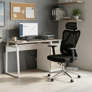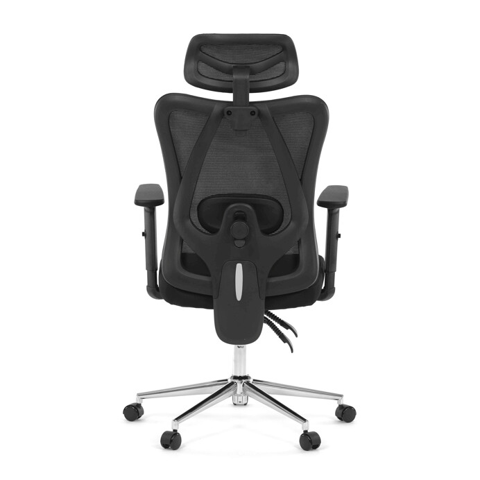Kancelářská židle s označením KA-R216 BK nabízí komfortní sezení díky černému potahu z prodyšné síťoviny mesh, který zajišťuje optimální cirkulaci vzduchu. Opěrák je vybaven nastavitelným podhlavníkem a bederní opěrkou, které podporují správné držení těla během dlouhých pracovních hodin. Židle disponuje výškově nastavitelným mechanismem s polohováním opěráku. Pevný hliníkový kříž zaručuje stabilitu a odolnost, zatímco jednosměrně nastavitelné 1D područky přispívají k ergonomii a pohodlí. Celková konstrukce je navržena pro dlouhou životnost a nosnost odpovídající běžným kancelářským požadavkům.