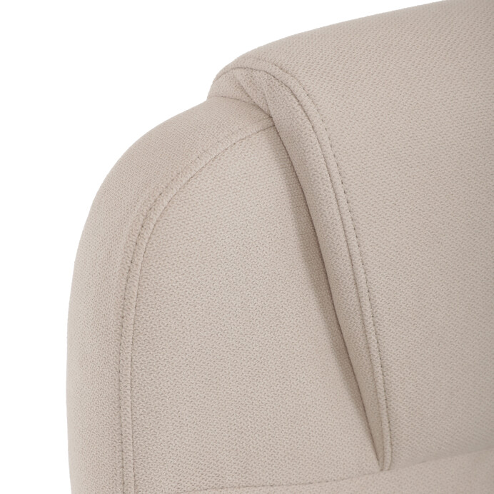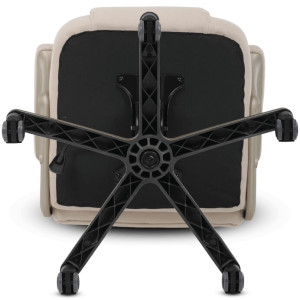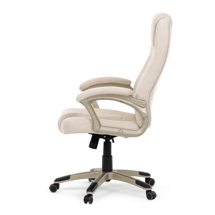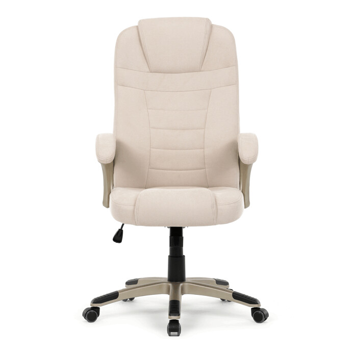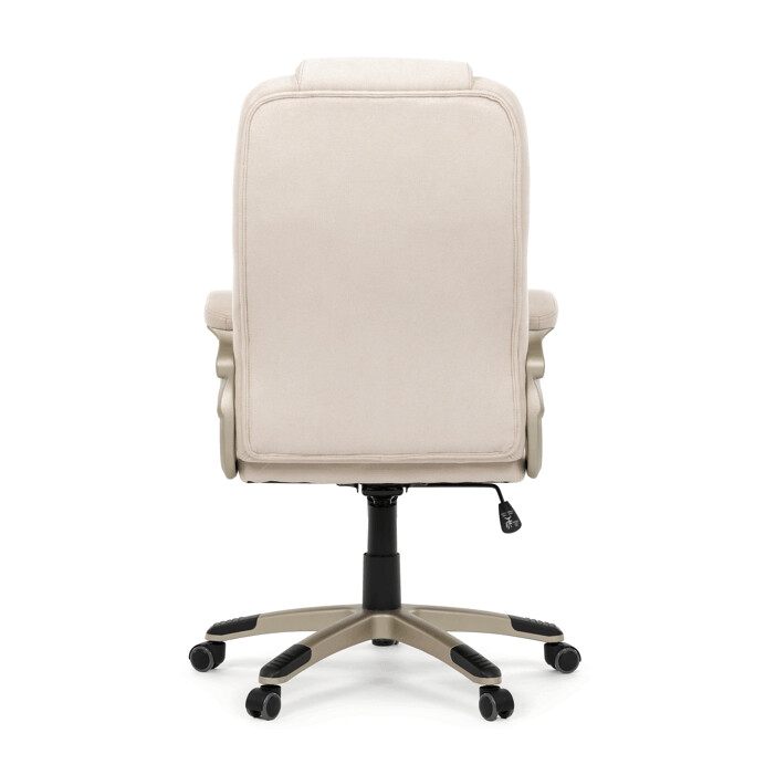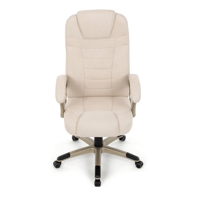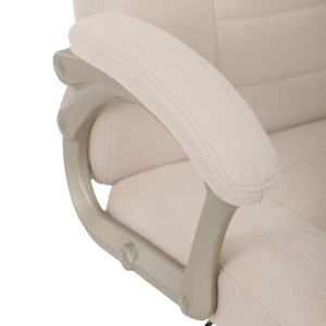 Kancelářské křeslo v béžovém provedení kombinuje komfort s praktickým designem vhodným pro dlouhodobé sezení. Čalounění z kvalitní látky zajišťuje příjemný povrch a snadnou údržbu, zatímco pevné područky s měkkým polstrováním podporují pohodlí paží. Vysoký opěrák je doplněn pevnou opěrkou hlavy s vyměkčenou vrchní částí, která přispívá k lepší podpoře krční páteře. Houpací mechanismus umožňuje nastavení polohy sedáku a výšková nastavitelnost zajišťuje ergonomické přizpůsobení uživateli. Stabilní základna z plastu v odstínu champagne je vybavena kolečky vhodnými pro tvrdé povrchy, což usnadňuje mobilitu a zároveň chrání podlahu.