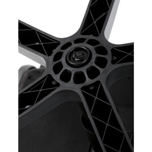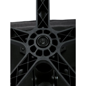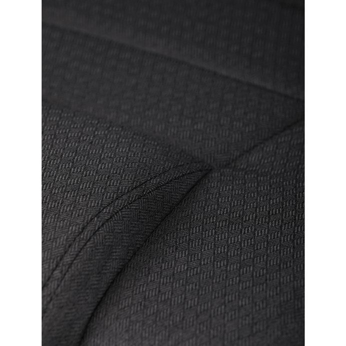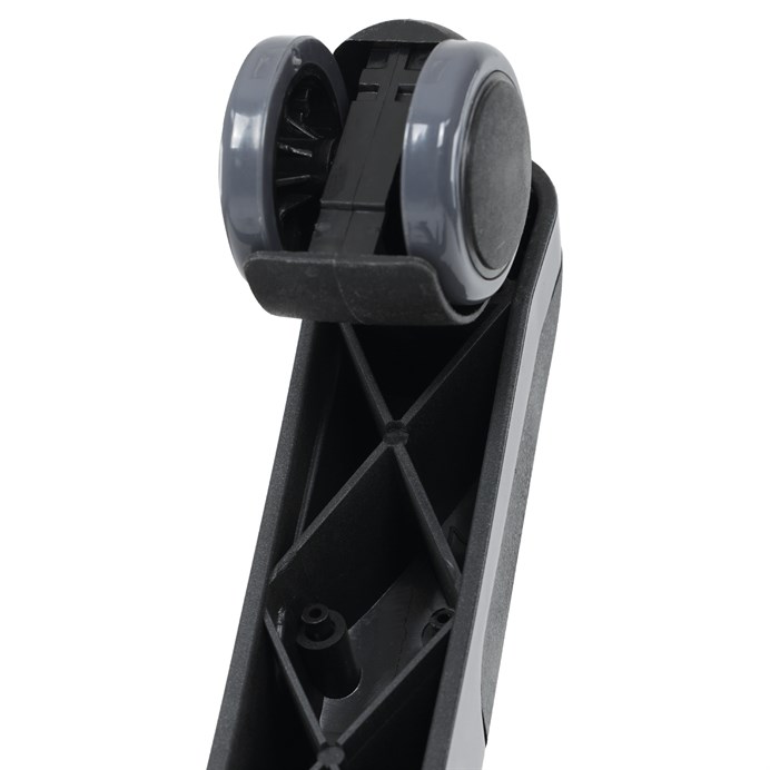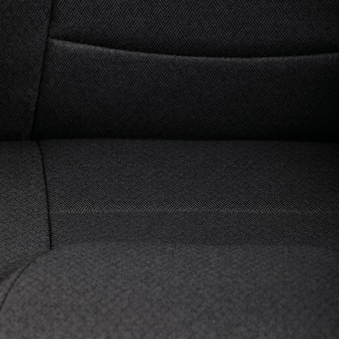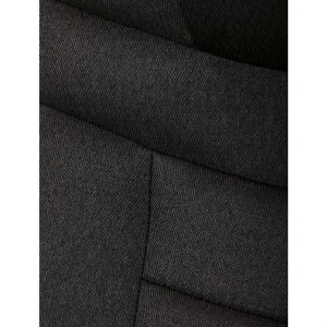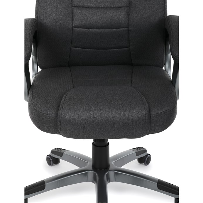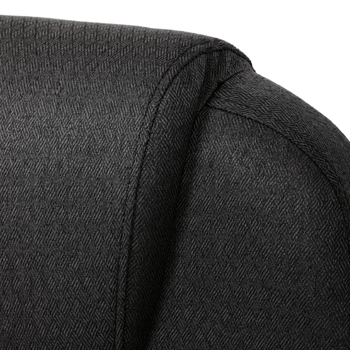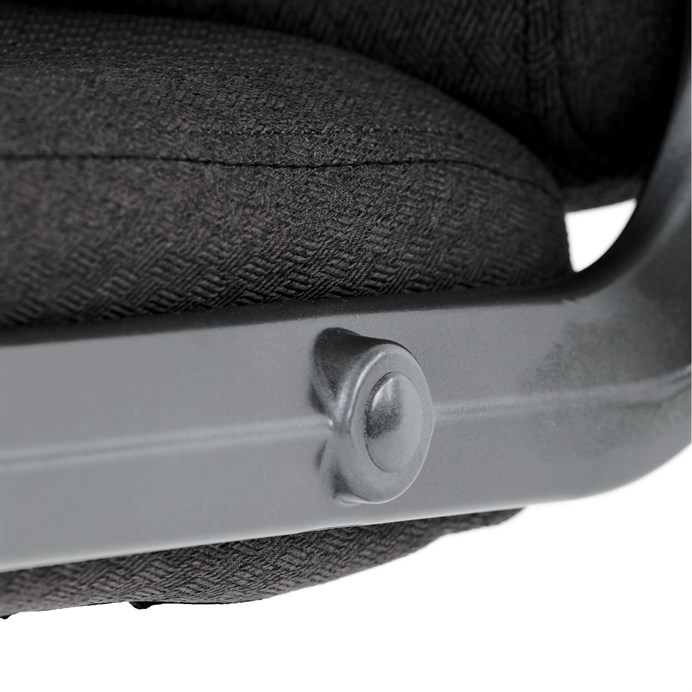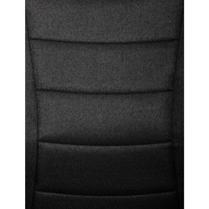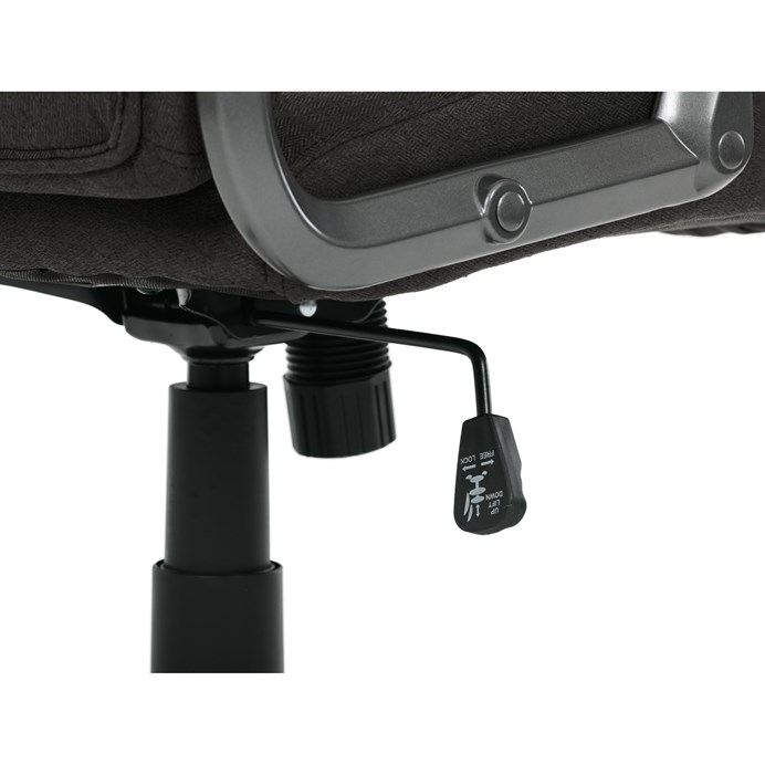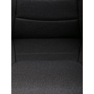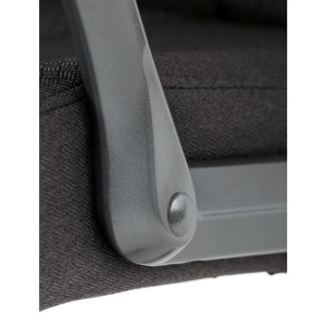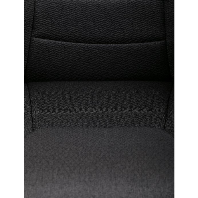 Kancelářské křeslo v černé látce nabízí vysoký opěrák s pevnou opěrkou hlavy a vyměkčenou vrchní částí pro zvýšený komfort při dlouhodobém sezení. Pevné čalouněné područky jsou integrovány do šedého plastového rámu, který spolu s plastovým křížem zajišťuje stabilitu a lehkost. Houpací mechanismus umožňuje příjemné naklánění s možností aretace v základní poloze, zatímco výškově nastavitelná sedací plocha umožňuje přizpůsobení výšky podle potřeby uživatele. Kolečka jsou vhodná pro tvrdé povrchy, což zajišťuje snadný pohyb bez poškození podlahy. Celkově je židle navržena pro pohodlné a ergonomické sezení v kancelářském prostředí.