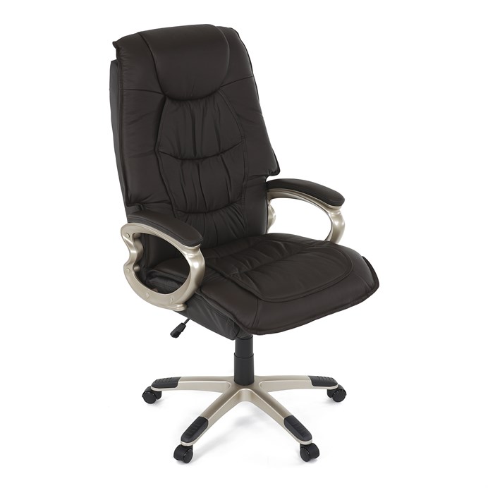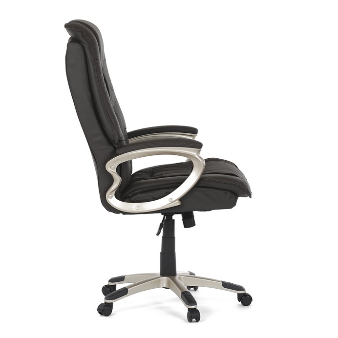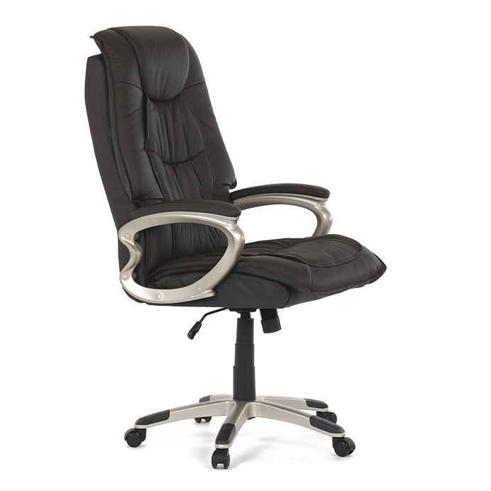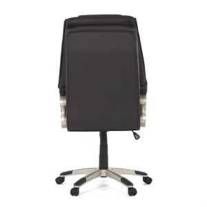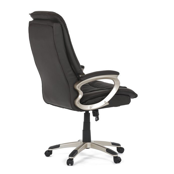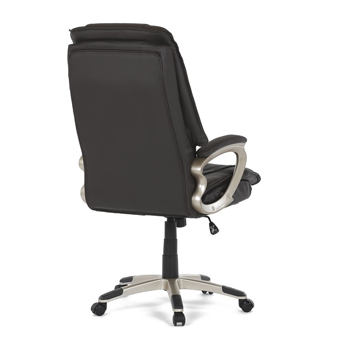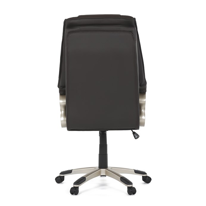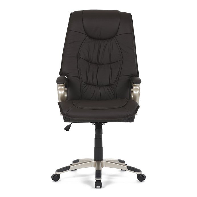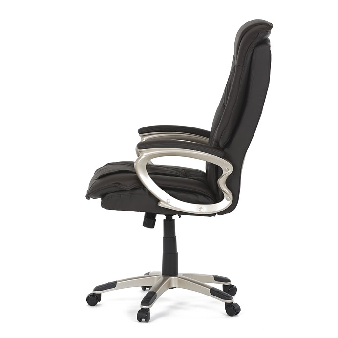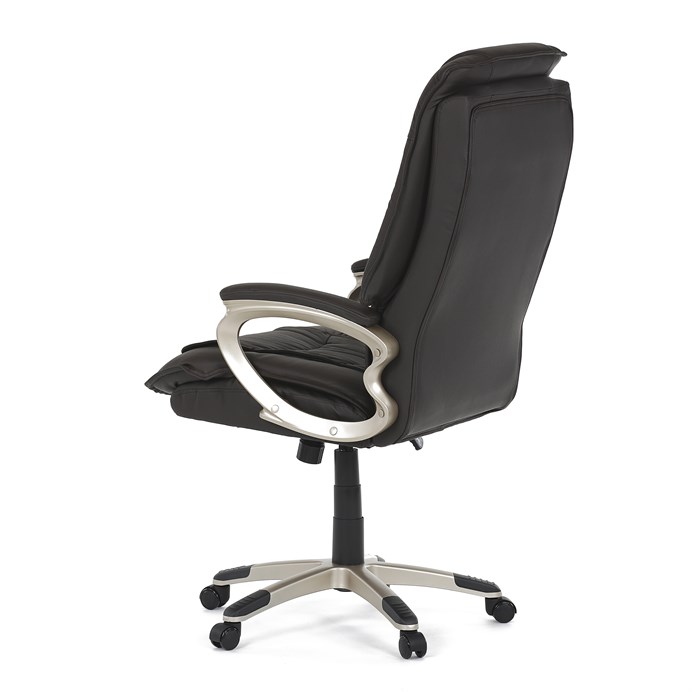 Kancelářská židle v tmavě hnědém koženém čalounění nabízí ergonomicky tvarovaný design s vysokým polstrováním sedáku i opěradla pro pohodlné sezení během dlouhých pracovních hodin. Pevné područky jsou čalouněné stejným materiálem a doplněné o plastové prvky v barvě champagne, které ladí s plastovým křížem židle. Houpací mechanismus umožňuje plynulé naklápění a nastavení výšky sedáku podle individuálních potřeb uživatele. Kolečka jsou určena pro tvrdé podlahy, což zajišťuje snadnou mobilitu bez poškození povrchu. Celkově je židle navržena s důrazem na komfort, stabilitu a kvalitní zpracování vhodné do kancelářského prostředí.