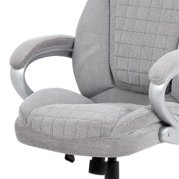 Kancelářská židle v šedé látce nabízí komfortní sezení díky houpacímu mechanismu s možností výškového nastavení. Čalouněné pevné područky s vyměkčenou vrchní částí zajišťují pohodlí při delším používání. Sedák a opěradlo jsou zdobeny designovým prošitím, které zároveň přispívá k estetice židle. Plastový stříbrný kříž poskytuje stabilní základnu s kolečky pro snadnou mobilitu. Židle je vhodná pro kancelářské prostředí, kde je kladen důraz na komfort a funkčnost.