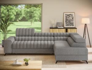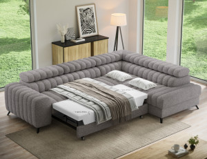 Dotaz na produktThe Kanedo corner sofa is a designer and highly functional upholstered piece that combines modern aesthetics with exceptional comfort, making it an ideal choice for a spacious living room or relaxation area. With overall dimensions of 269 × 204 × 86 cm and a weight of 146.2 kg, this model stands out for its solid construction and carefully profiled elements that provide ergonomic body support and outstanding relaxation. The seat is equipped with Type B wave springs and a combination of T3030 foam and profiled HR3030 high-resilience foam, ensuring optimal elasticity, durability, and long-lasting seating comfort even with intensive use. The backrest, filled with T2130 polyurethane foam, offers stable support and enhances everyday comfort. The Kanedo corner sofa features a practical sleeping function with a surface of 194 × 124 cm, while the Dolphin mechanism allows for quick and effortless unfolding. An additional advantage is the spacious bedding storage compartment measuring 180 × 92 × 17 cm, providing convenient storage for textiles and making the Kanedo corner sofa an excellent choice for those looking for a modern corner sofa with a sleeping function, storage space, and durable, high-quality filling.Fabrics: Paolli 04