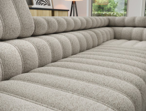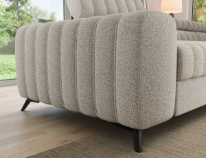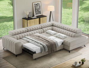 Dotaz na produktThe Kanedo corner sofa is a designer and highly functional upholstered piece that combines modern aesthetics with exceptional comfort, making it an ideal choice for a spacious living room or relaxation area. With overall dimensions of 269 × 204 × 86 cm and a weight of 146.2 kg, this model stands out for its solid construction and carefully profiled elements that provide ergonomic body support and outstanding relaxation. The seat is equipped with Type B wave springs and a combination of T3030 foam and profiled HR3030 high-resilience foam, ensuring optimal elasticity, durability, and long-lasting seating comfort even with intensive use. The backrest, filled with T2130 polyurethane foam, offers stable support and enhances everyday comfort. The Kanedo corner sofa features a practical sleeping function with a surface of 194 × 124 cm, while the Dolphin mechanism allows for quick and effortless unfolding. An additional advantage is the spacious bedding storage compartment measuring 180 × 92 × 17 cm, providing convenient storage for textiles and making the Kanedo corner sofa an excellent choice for those looking for a modern corner sofa with a sleeping function, storage space, and durable, high-quality filling.Fabrics: Royal 18