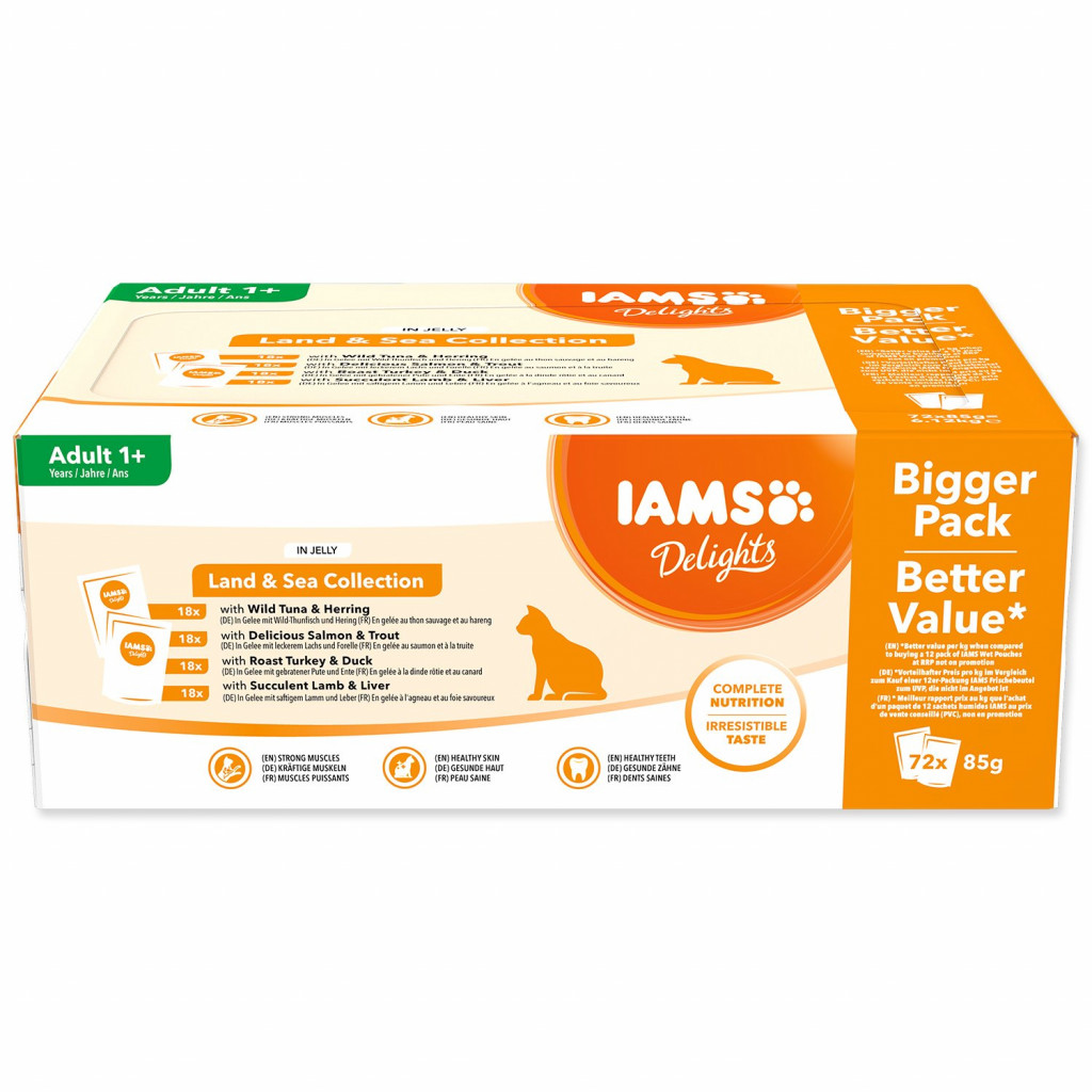 Dotaz na produkt Na splátky ještě dnesPevninská a mořská kolekce IAMS Delights v rosolu je 100% kompletní a vyvážené prvotřídní mokré krmivo pro dospělé kočky v praktickém balení multipack.