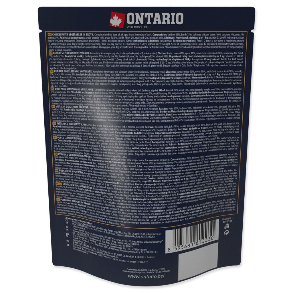 Kuřecí maso 62%, vývar 18%, změkčené kuřecí kosti 10%, brambory 4%, hrách 3%, mrkev 3%.