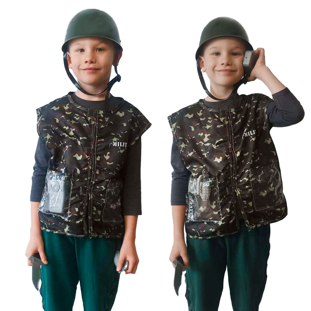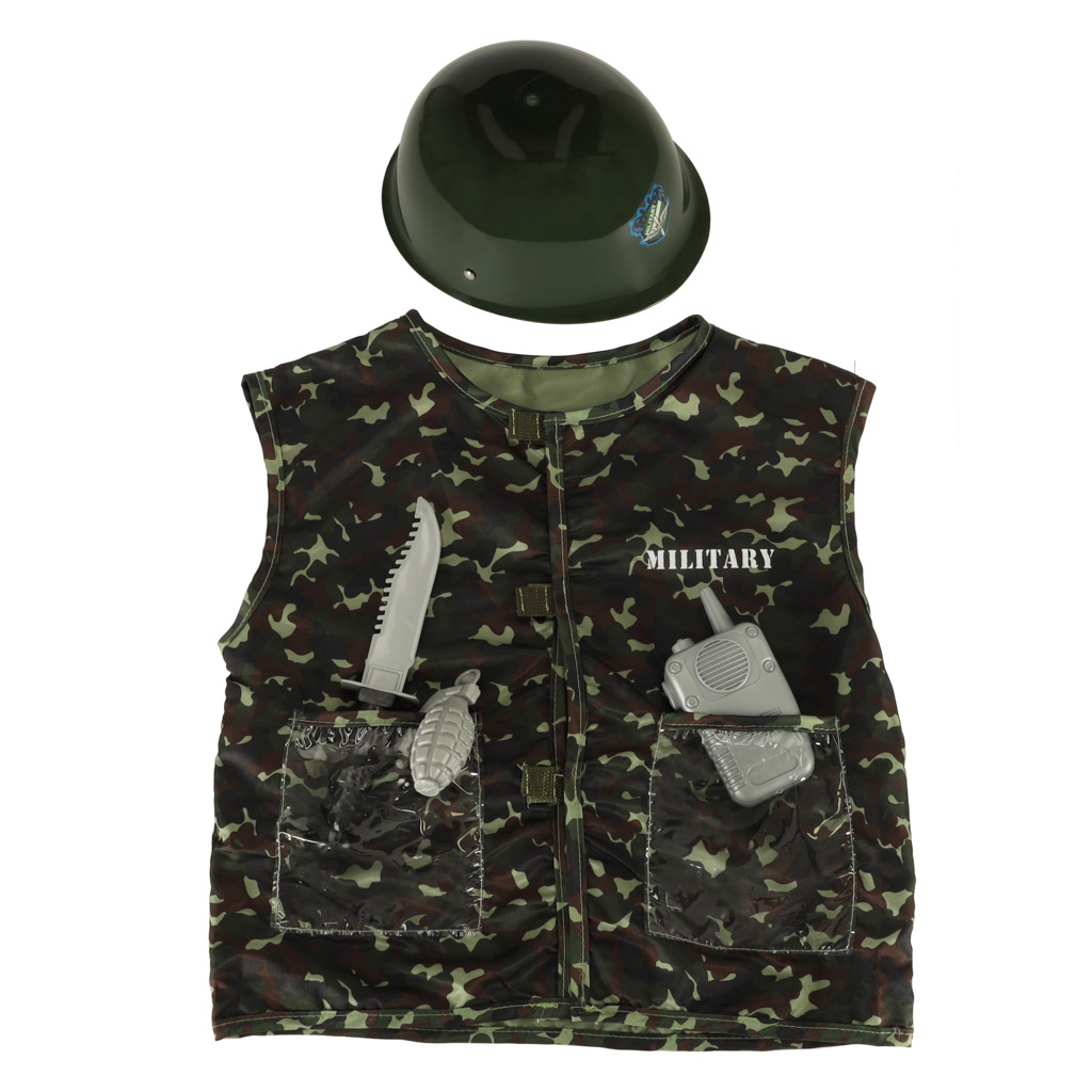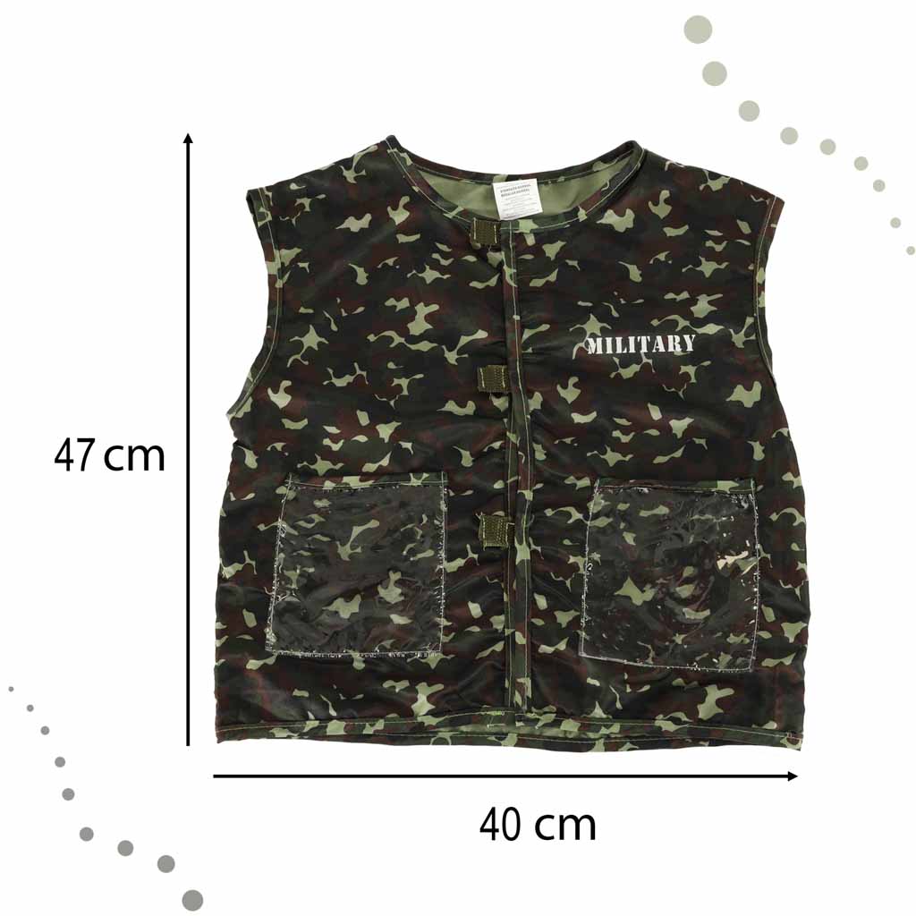 Součástí sady je vesta se vzorem moro a vojenská helma!