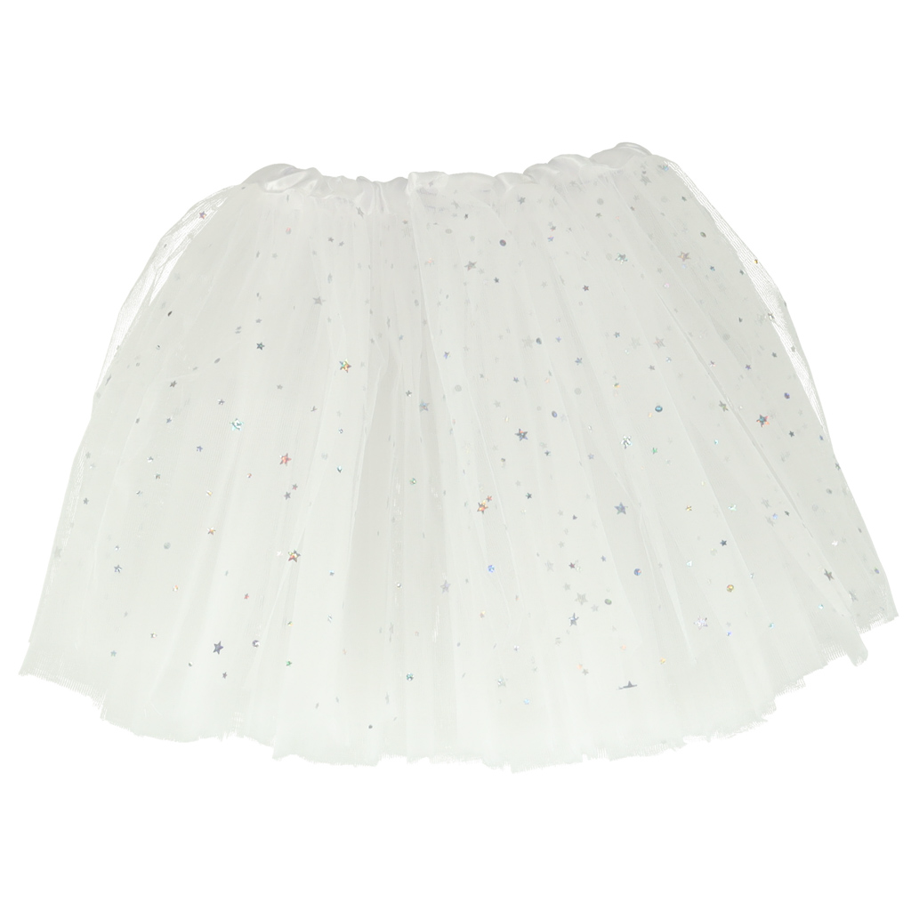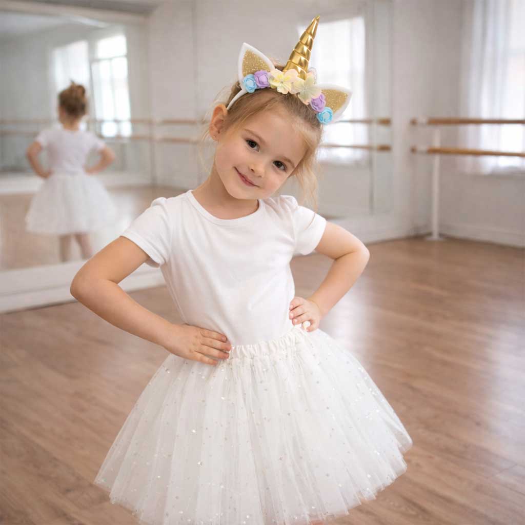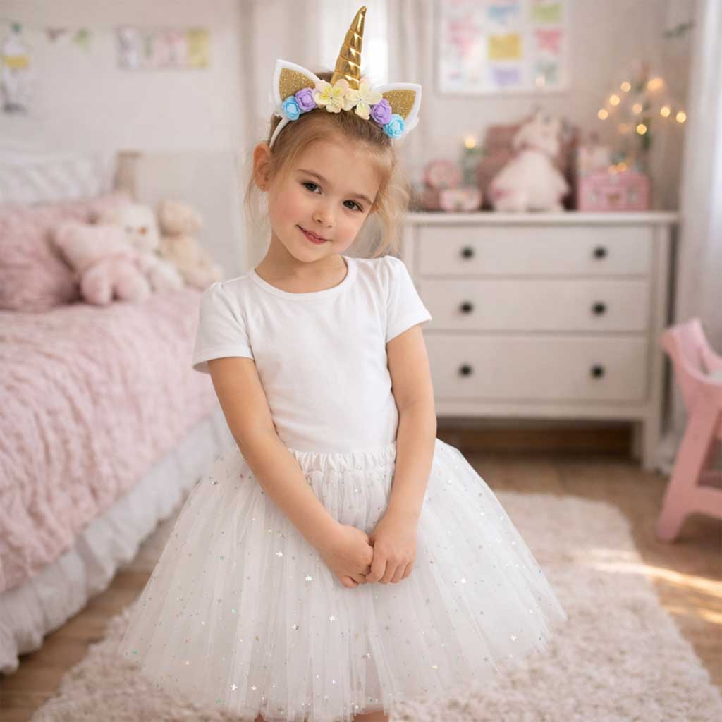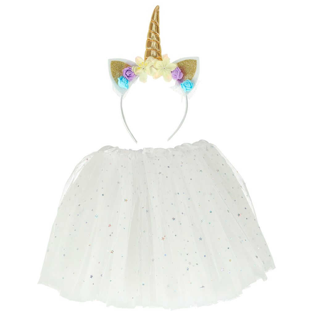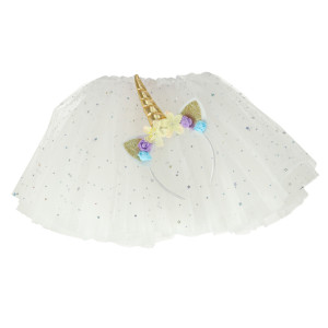 Karnevalovýkostýmjednorožce s čelenkou a bílou princeznovskou sukní pokrytou třpytivými hvězdami.