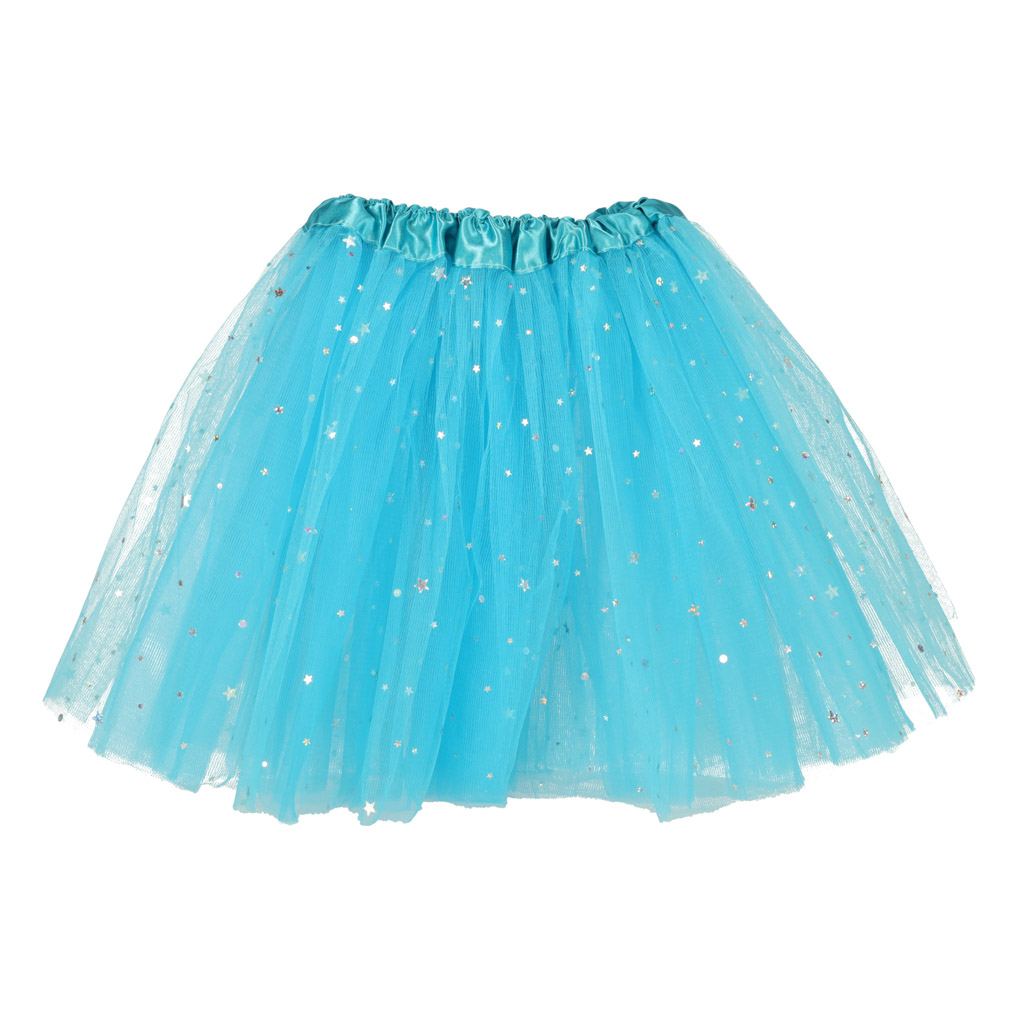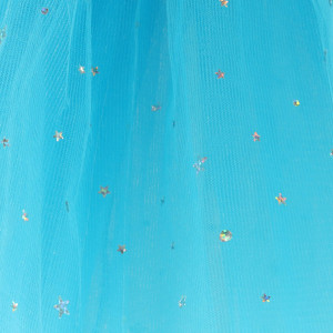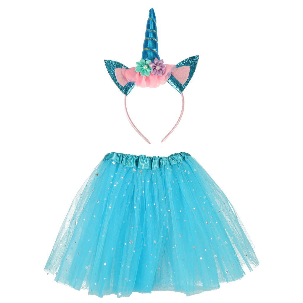 Karnevalový kostým s čelenkou jednorožce a modrou princeznovskou sukní pokrytou třpytivými hvězdami.